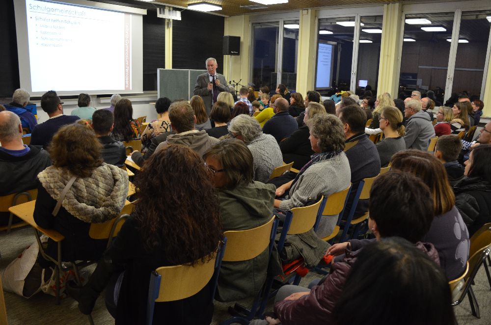Wie im letzten Jahr verzögerte der Novembermarkt in der Schloßstraße die Anfahrt zur Schule - die zentrale Informationsveranstaltung im Musiksaal begann leicht verspätet. Schulleiter Herr Kallenbach informierte über die besonderen Unterrichts- und Lernangebote und Orientierungsstufenleiter Herr Clemenz stellte das "LeKo"-Konzept vor - als Teil der Bemühungen, mit dem das Leibniz den Übergang an das Gymnasium erleichtern will.