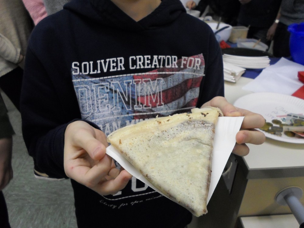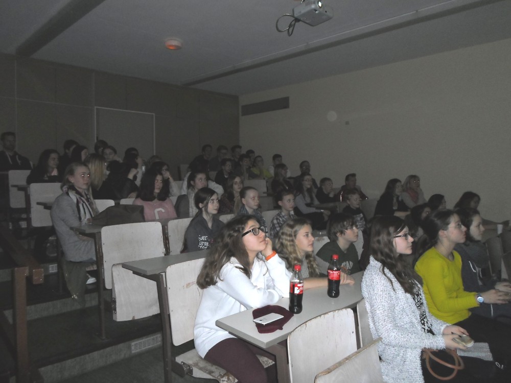 Bereits ab 18.00 Uhr wurden die gut fünfzig Filmfreunde im Physik-Übungssaal mit frisch zubereiteten Crêpes und Orangensaft willkommen geheißen. Gut gestärkt nahm man dann im bis auf den letzten Platz besetzten Physik-Lehrsaal Platz, in dem um 18.45 Uhr das Licht heruntergefahren und die Filmprojektion begonnen wurde.