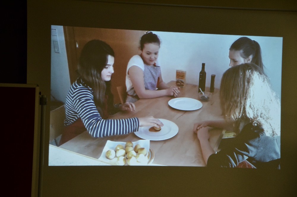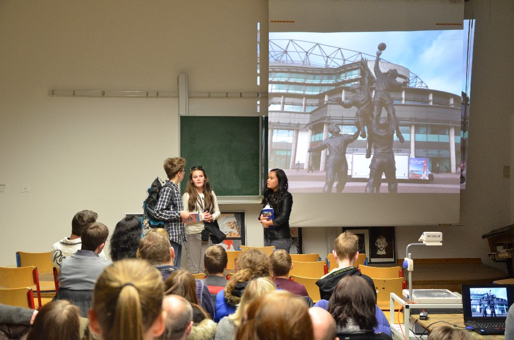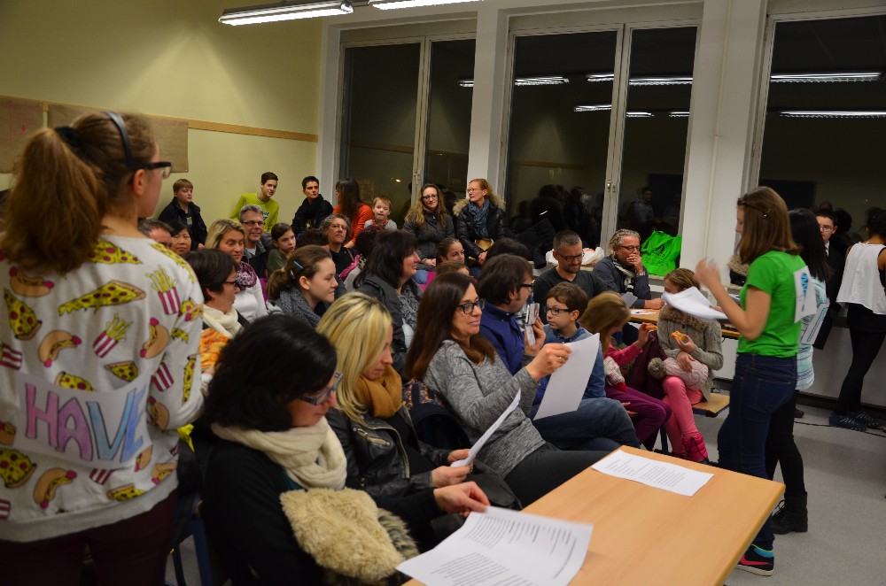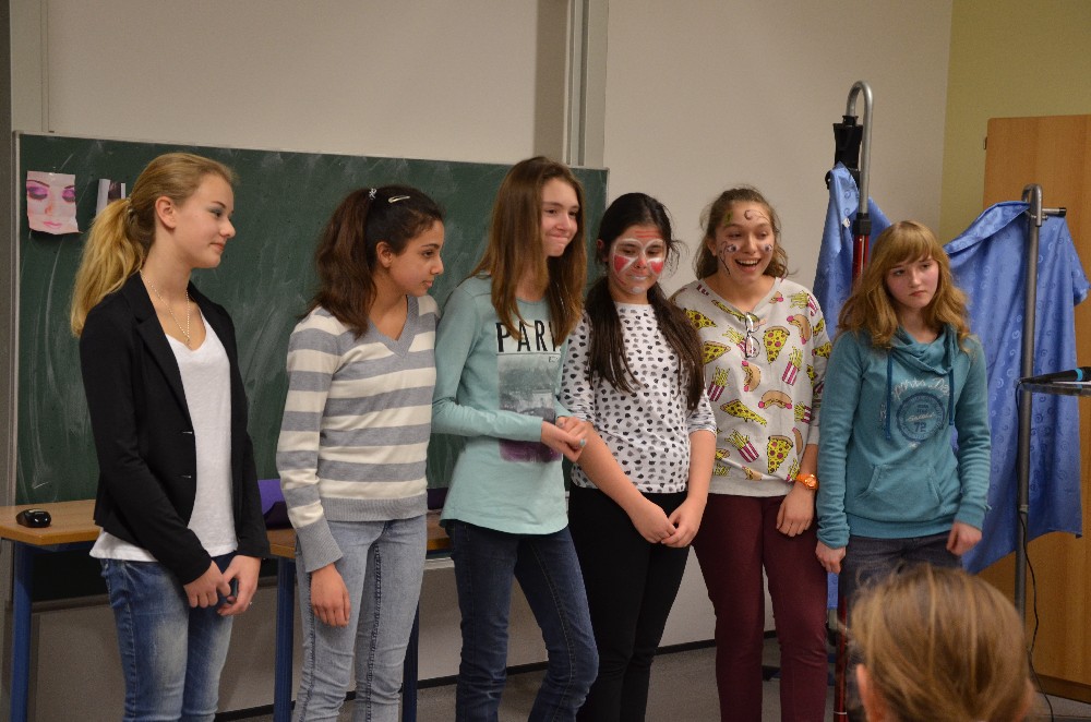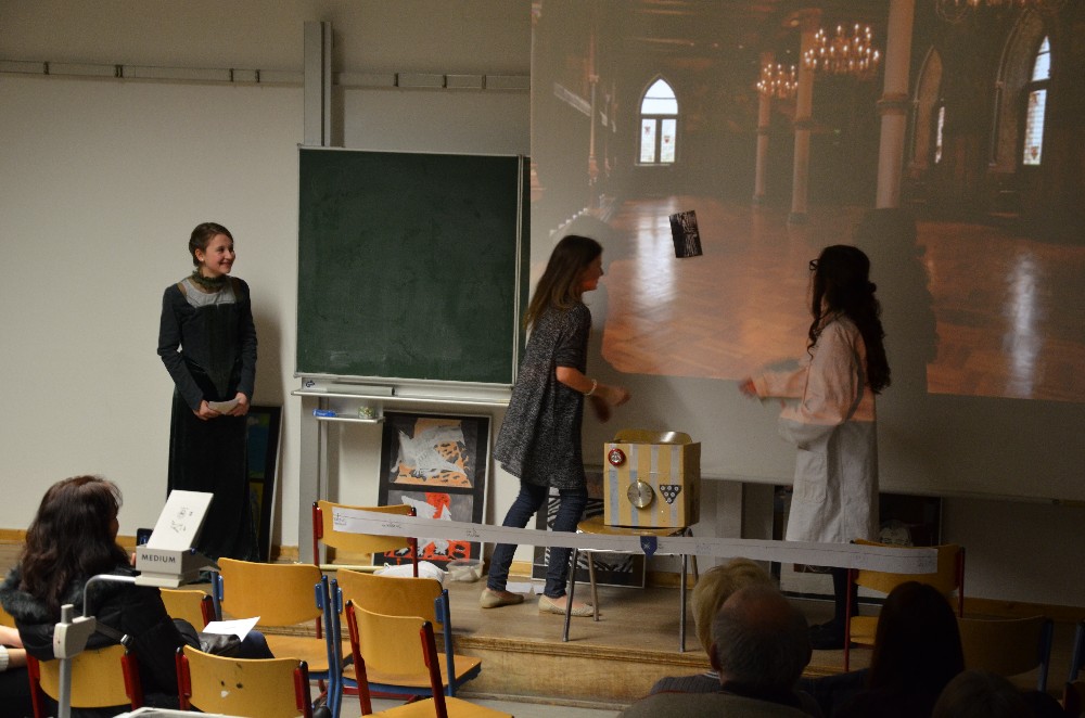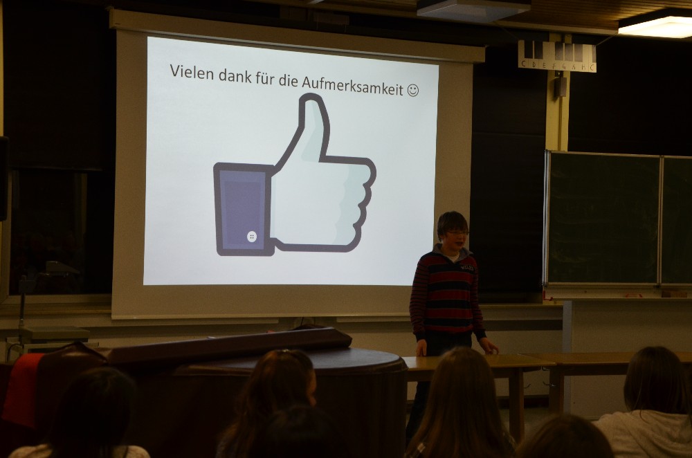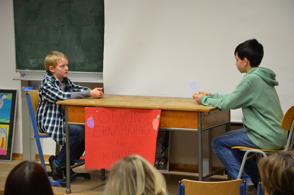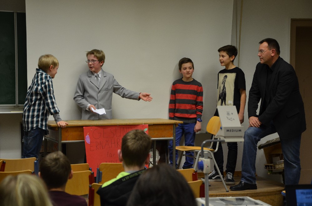 Alle Schüler bereiteten ihre Ergebnisse für eine publikumswirksame Präsentation auf. Zahlreiche Eltern erlebten, wie ihre Kinder das Lampenfieber durch unterhaltsame Darbietungen bewältigten und mit dem Publikum durch eingeschobene Rückfragen aktiv interagierten.