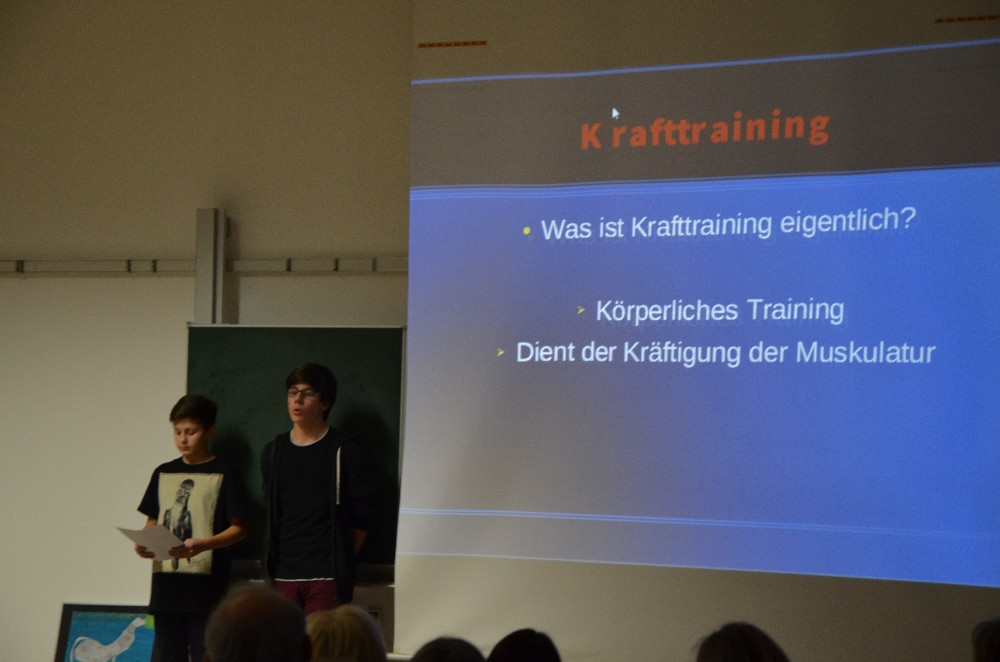 Am Dienstagabend präsentierten die Schüler der Jahrgangsstufe 7 einem großen Eltern-Publikum ihre Vortragskunst. Unter dem Oberthema „Gesundheit" zeigten die Schüler ihre Methoden- und Kommunikationskompetenz: kurzweilige Präsentationen, freies Reden, selbsterhobene Versuchsdaten, Video-Dokumentationen und informative Spielszenen wurden aufgeboten. Neben der visuellen Inszenierung meisterten die 13-Jährigen auch die Herausforderungen einer professionellen Moderation: formelle Begrüßung des Publikums, gegliederte Vorstellung eines Themas, thematisches Überleiten sowie Abmoderation.