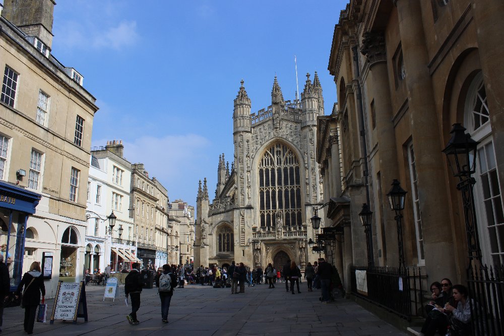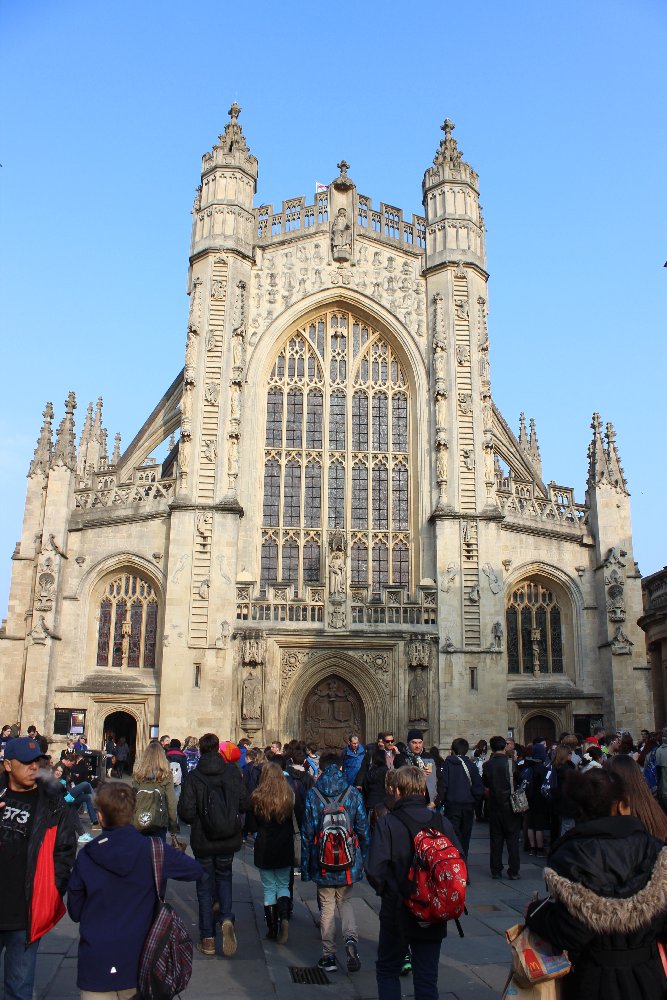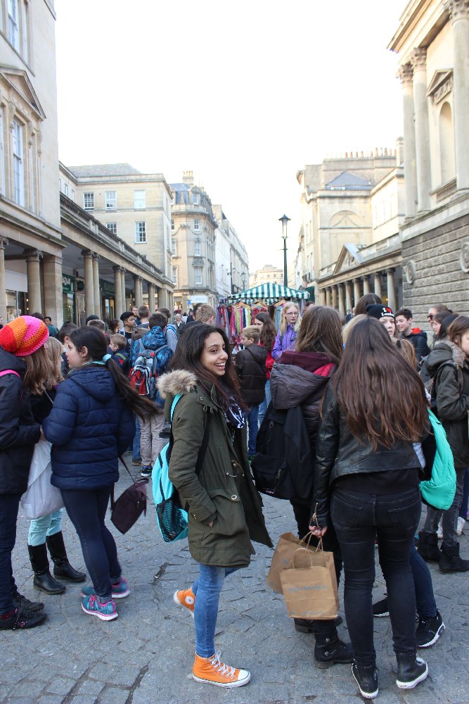 There was man with bird seed and there were a lot of doves sitting on his arms and head. We gave him some money and also fed the doves on our heads. We took some photos. Then we went into a lot of shops - Bath is very nice. (S.S.)