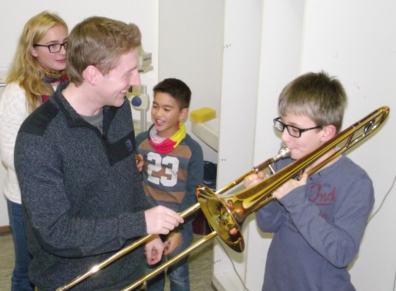 Die Schul-Big Band LGProject eröffnete wie immer souverän mit zwei Liedern den Abend und machte den künftigen Sextanern auch direkt Lust, sich selbst an den Instrumenten zu erproben. Die Band-Mitglieder nahmen die Viertklässler dann gleich in Empfang und schickten sie auf eine Instrumenten-Rallye. Währenddessen stellte Frau Knörzer das Konzept (zum Nachlesen als PDF) der Big Band-Klasse den interessierten Eltern vor, die im Anschluss im Gespräch mit Fachlehrerin und Schulleiter Herrn Kallenbach noch offene Fragen klären konnten.