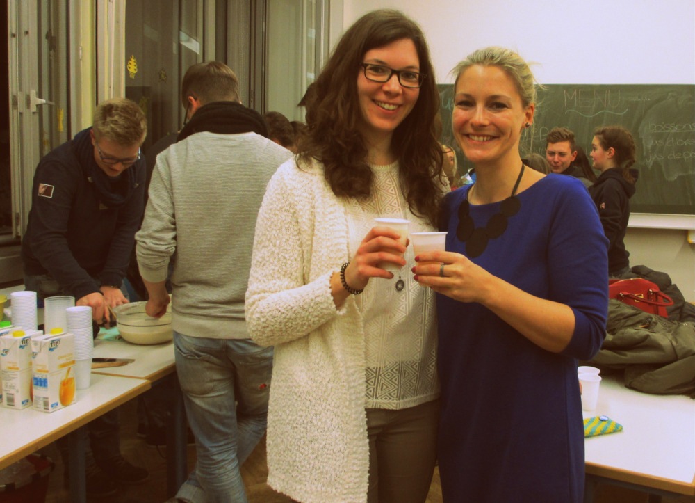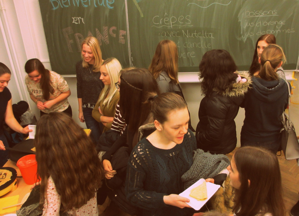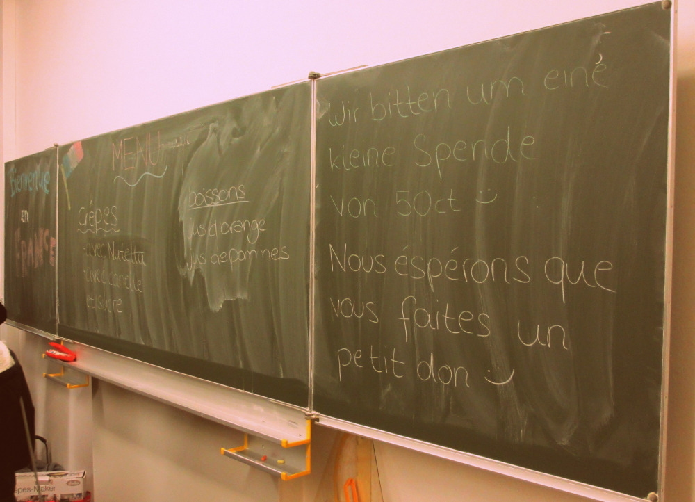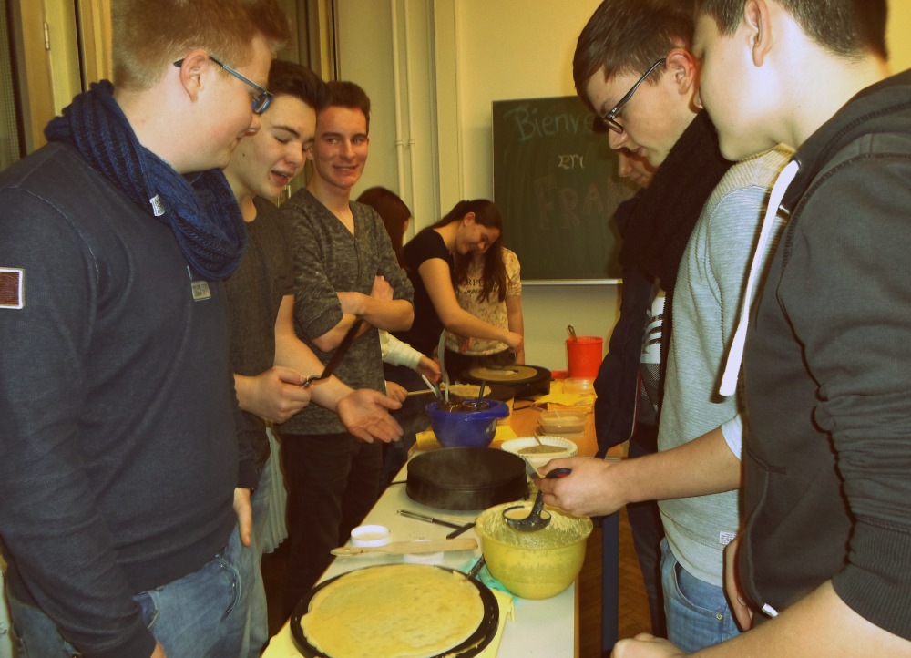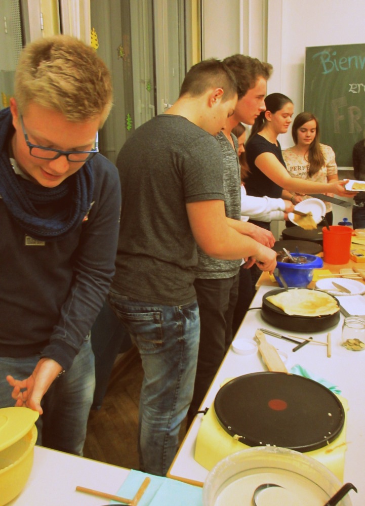 Um unsere Französischlerner kulinarisch zu verwöhnen, wurden ab 18 Uhr wieder Crêpes gebacken. Dank der Unterstützung von Leon Müller, Moritz Preiß, Philipp Reiser, Jonas Peifer und Patrick Kern (10c), Paul Ufelmann und Louisa Pawusch (LK F 11) sowie Nadine Gegenfurtner, Michelle Zwipf, Jana Wagner und Jessica Haas (LK/GK F 12) konnten alle Schüler gegen eine kleine Spende sowohl den ein oder anderen leckeren Crêpes als auch diverse Säfte genießen.