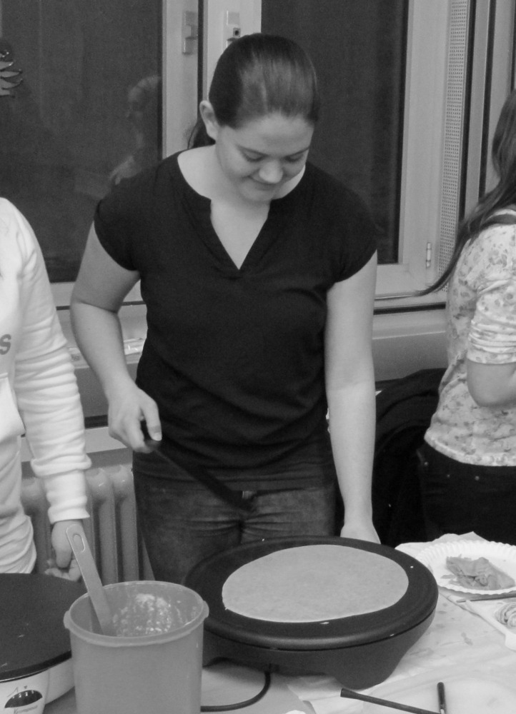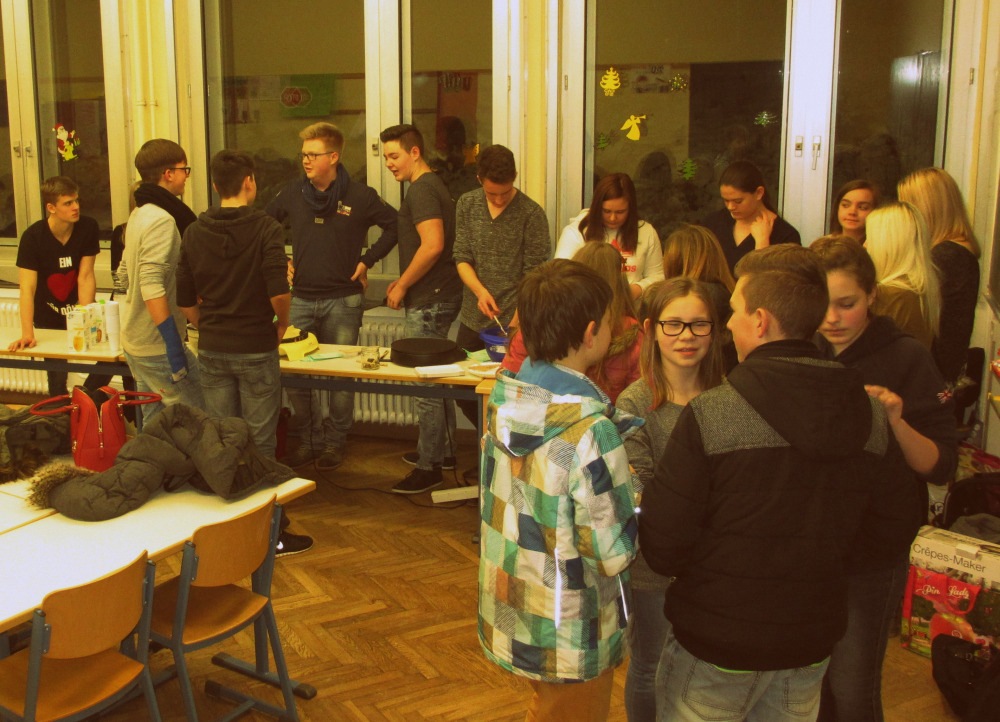 Die Filmvorführung begann nach einer kurzen offiziellen Begrüßung durch Herrn Günther-Spohr und Frau Schmalenbach gegen 19 Uhr, sodass nach einer Stunde eine 10-minütige Pause eingelegt werden konnte. In dieser wurden die restlichen Teigreserven in Crêpes verwandelt und die Schüler konnten gestärkt die letzten 45 Minuten des Films verfolgen.