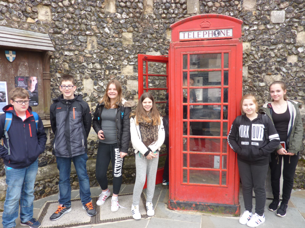 First we want to tell you something about typical British things, they only exist in Great Britain or are things Great Britain is famous for, e.g. fish and chips, red telephone boxes or double busses. Once we had fish and chips for dinner in our hostel and it tasted great! And we saw red telephone boxes in every place we were, e.g. Oxford or Lacock, the most beautiful village in the south of England. Most of us took a lot of photos from these telephone boxes. And we squeezed in them, too. We also saw some red double busses in London. Today they are used for tourists only. What a pity!