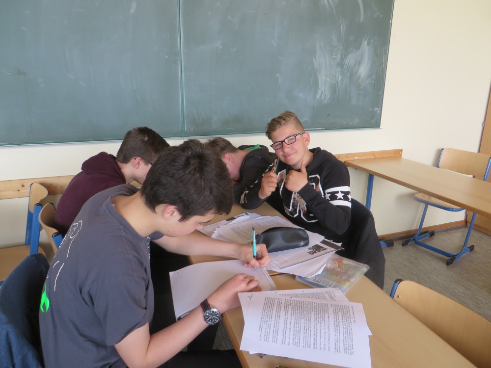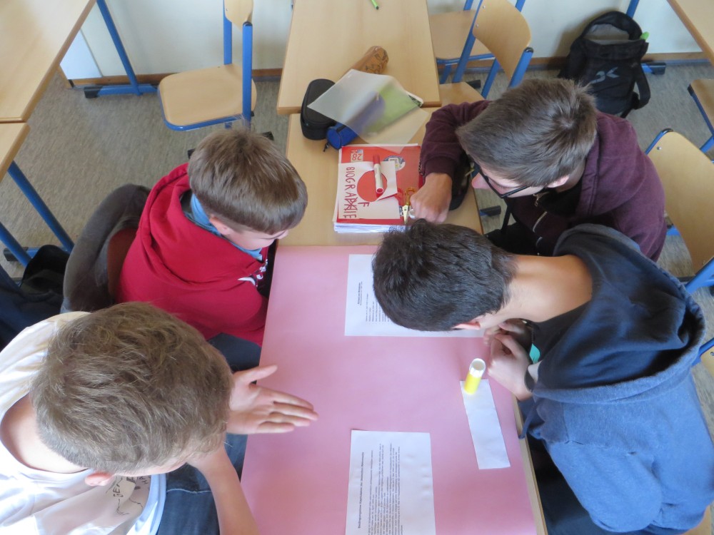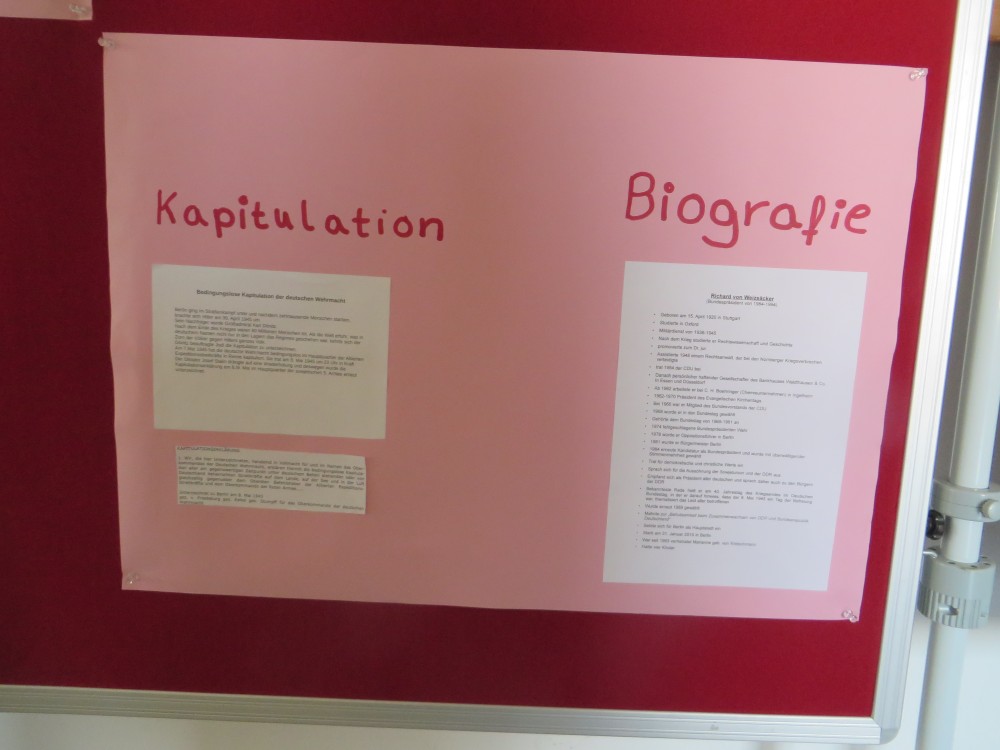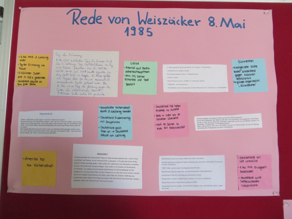 Im Geschichtsunterricht haben wir uns in einer Projektarbeit mit dem 8. Mai beschäftigt; Grundlage hierfür war die Rede Richards von Weizsäckers am 8. Mai 1995. Um diese bearbeiten zu können, wurden wir zunächst in verschiedene Gruppen eingeteilt. Jede Gruppe bekam einen Ausschnitt aus der Rede Weizsäckers und sollte diesen analysieren und Hintergrundinformationen recherchieren. Eine weitere Gruppe recherchierte die Ereignisse, die zur Kapitulation führten und letztendlich auch die Kapitulation Deutschlands 1945. Die Ergebnisse der einzelnen Gruppen wurden zusammengetragen und wir haben eine Collage mit verschiedenen Plakaten erstellt.