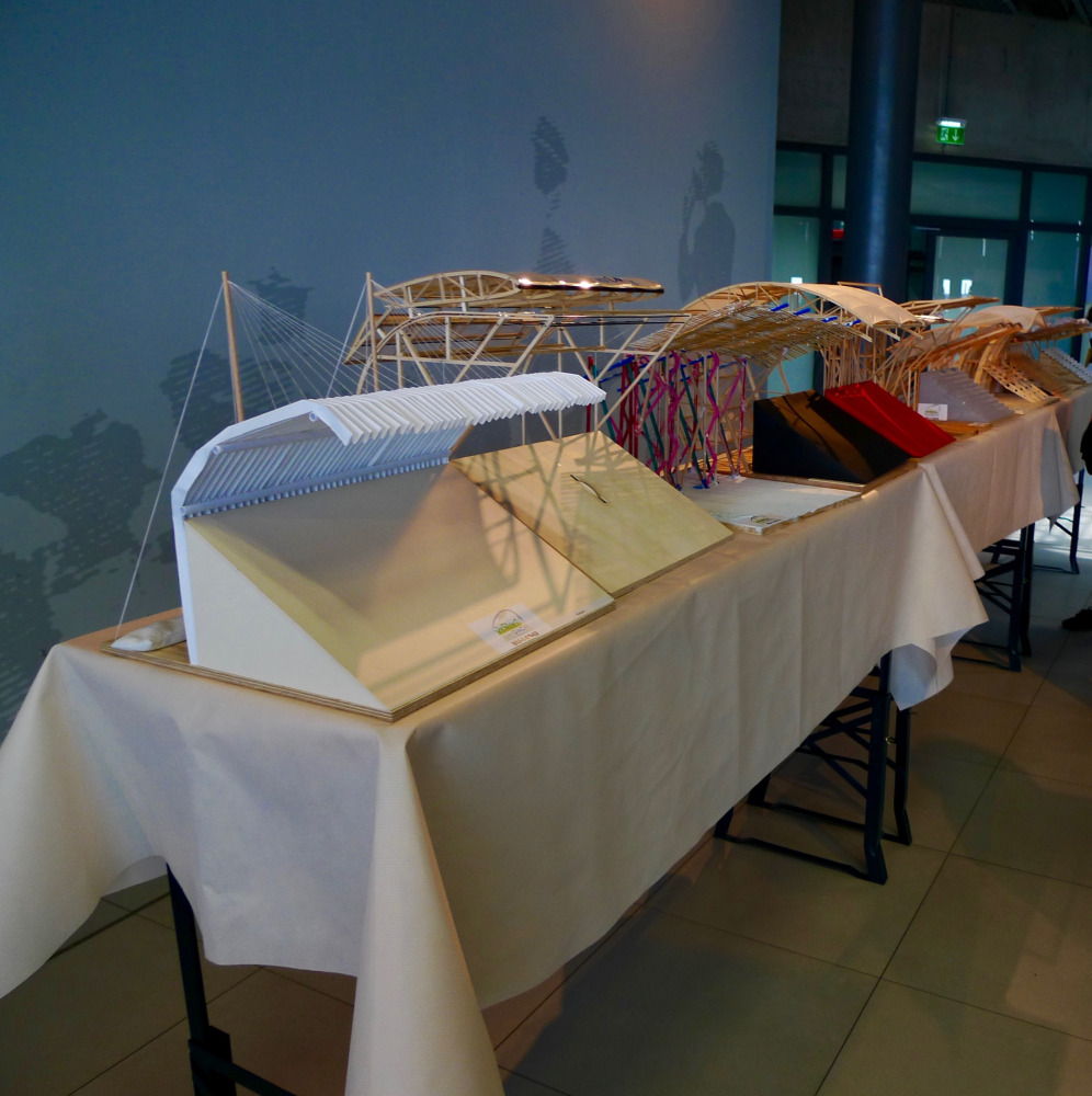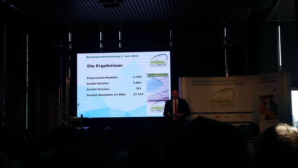 Passend zur Fußball-Europameisterschaft 2016 lobte die Bundesingenieurkammer den neunten länderübergreifenden Schülerwettbewerb unter dem Motto „überDACHt" aus. Aufgabe war in diesem Schuljahr der Entwurf und Modellbau einer Dachkonstruktion über der Zuschauertribüne eines Fußballstadions, die eine Last von 250 Gramm tragen muss. Zudem mussten weitere Wettbewerbsvorgaben, wie die Verwendung einfachster Baumaterialien (z.B. Papier, Holz, Textilien, Folie, Kunststoff, etc.) und die Einhaltung bestimmter Abmessungen eingehalten werden.