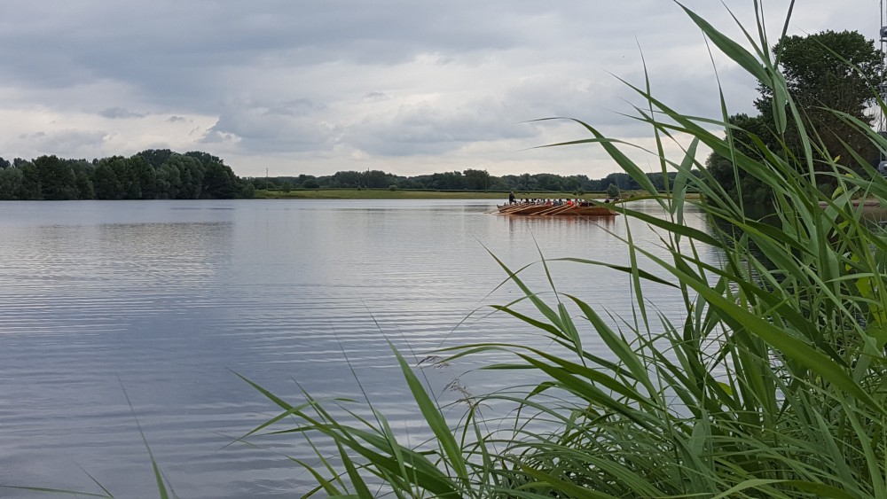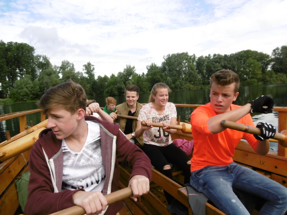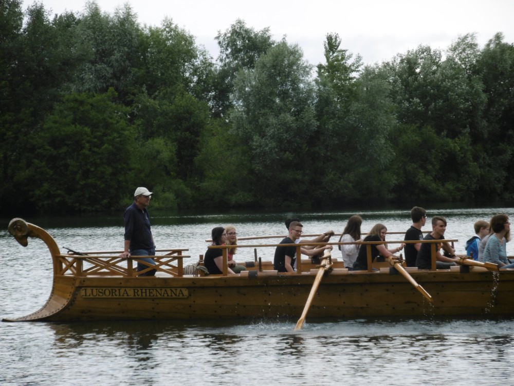 Danach machten wir alle zusammen eine Pause im Anglerheim in Neupotz. Dort gab es leckeres Essen und wir tauschen uns über die verschiedenen Themen aus. Daraufhin ging es dann auch für uns an Bord der Lusoria. Zuerst wurden uns verschiedene Regeln und Ruderarten erklärt. Wir konnten diese auch gleich selbst ausprobieren. Während der doch recht anstrengenden Bootsfahrt wurden verschiedene Herausforderungen an uns gestellt. Zwei Beispiele dafür sind die Fahrt mit verbundenen Augen und das Läuten einer Glocke mithilfe einer Stange, die einer der Betreuer in der Hand hielt. Dort haben wir viel über die Geschichte des römischen Militärs, vor allem der Römerboote und deren Besatzung gelernt.