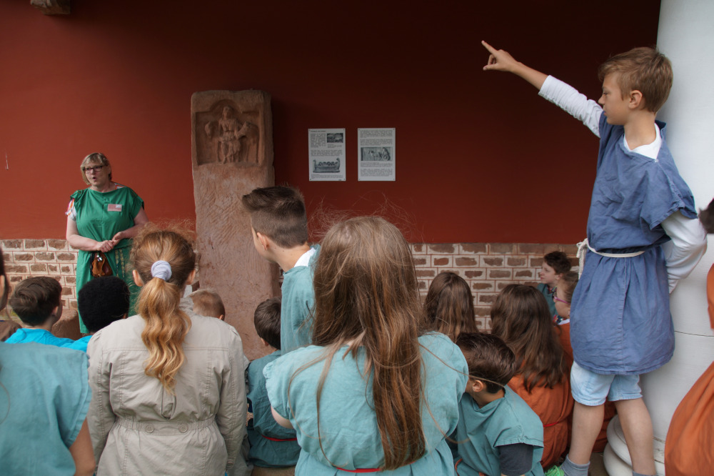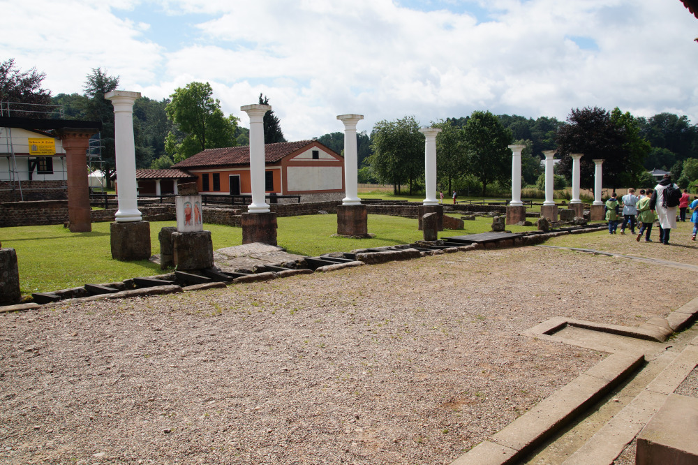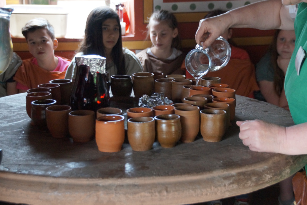 Zuerst ging es unter kundiger Führung durch die Ausgrabungen und rekonstruierten Gebäude, über die Straßen und durch die Keller der römischen Provinzstadt, deren ursprünglicher Name sich leider nirgendwo erhalten hat. Dafür weiß man aber, dass die örtliche Kneipe von einem Wirt namens Capitolinus betrieben wurde, denn der hatte die Gerätschaften, die sich bei den Ausgrabungen wiederfanden, mit seinem Namen beschriftet. Dort gab es gleich den ersten römischen Umtrunk, Wasser mit Apfelessig versetzt – gewöhnungsbedürftig.