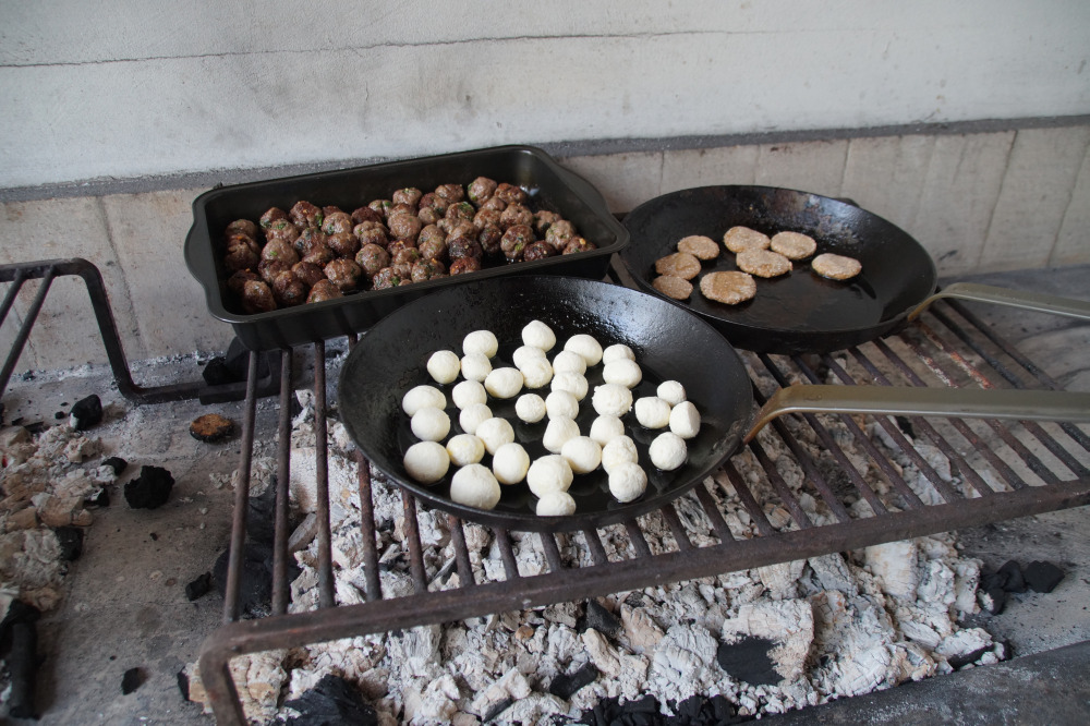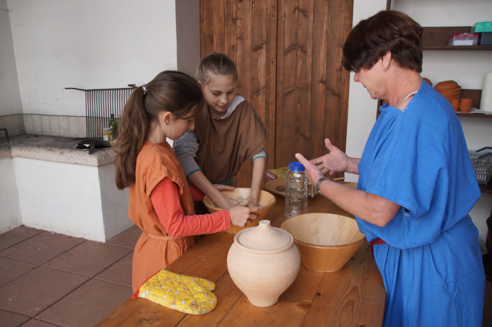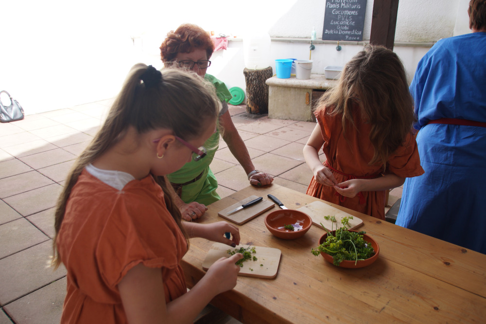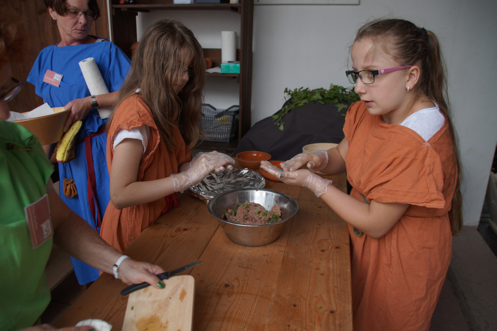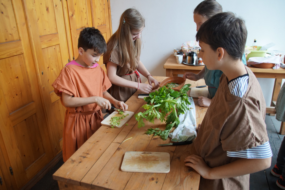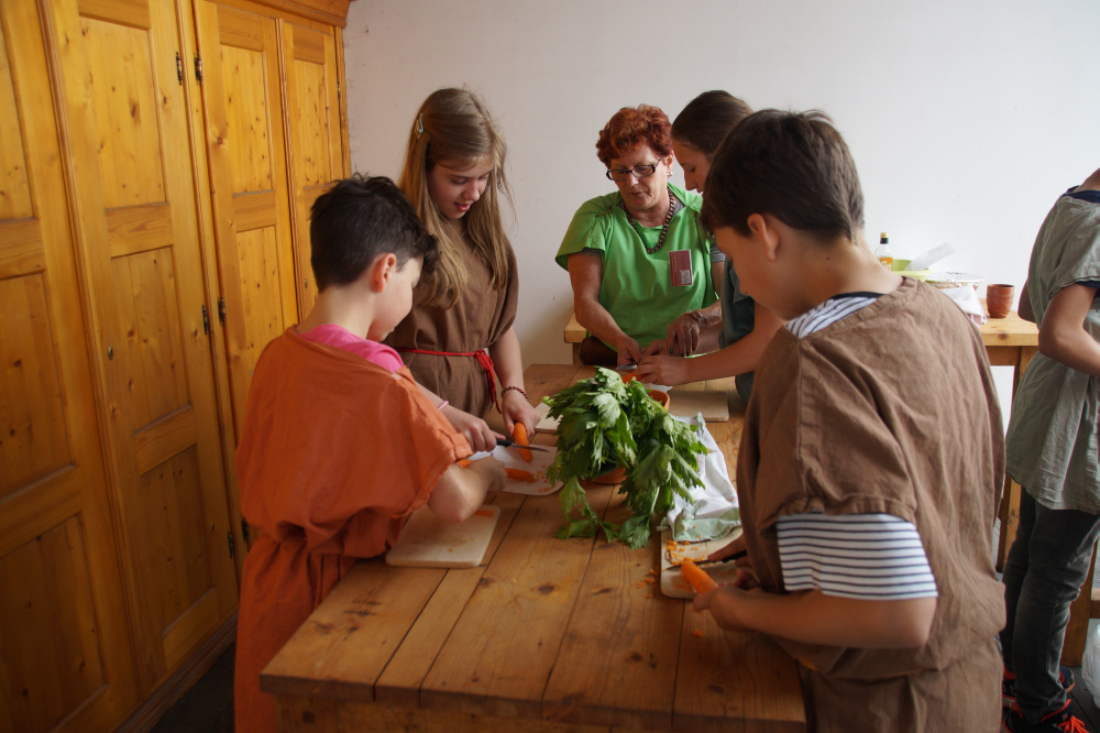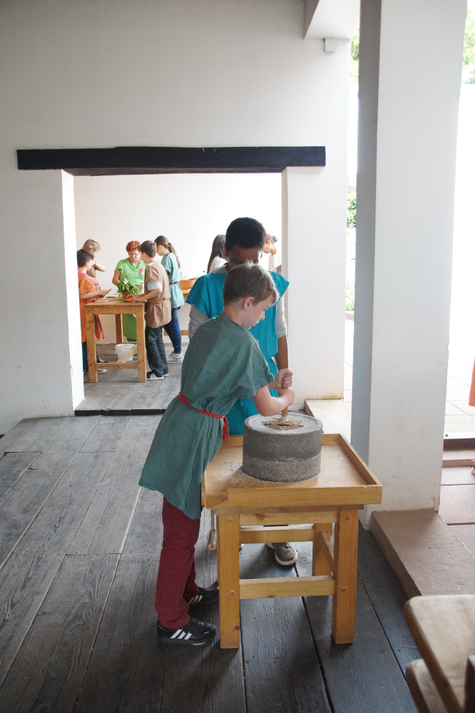 Nach den Besichtigungen wurden die Sechstklässler in zwei Gruppen geteilt: Die Kochsklaven in die Küche, die Handwerker zum Mosaiklegen. Nach einer Stunde wurde getauscht. Vom Mahlen des ganzen Korns in der Steinmühle über das Kneten des Teigs und Kleinschneiden des Gemüses bis zum Rollen der Fleischbällchen war alles ehrliche Handarbeit. Und wer arbeitet, darf schließlich auch essen: „Lecker!" war das häufigste Urteil.