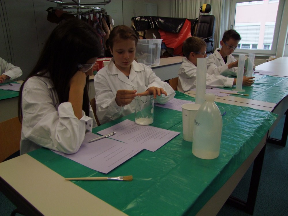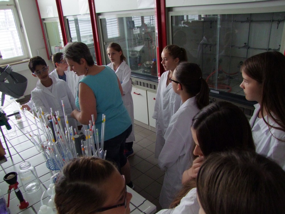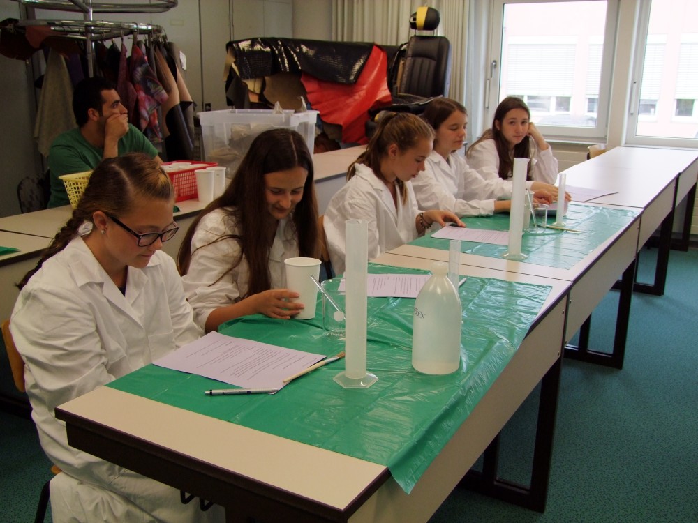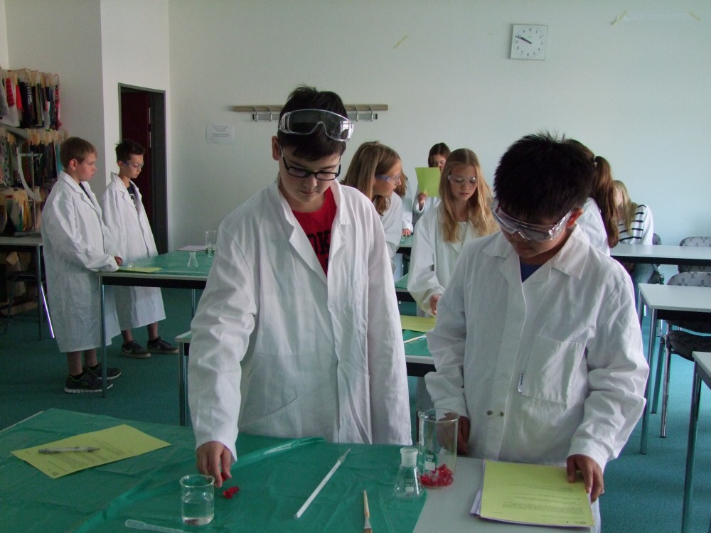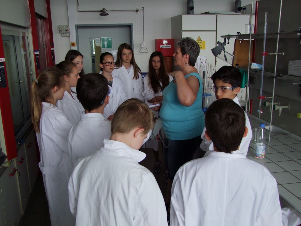 Am 11. Juli 2016 durften die Schülerinnen und Schüler der Klassen 6b und 6c am Tag der Chemie an der Hochschule Kaiserslautern mit Standort Pirmasens teilnehmen. In Zusammenarbeit mit der Firma Kömmerling Chemische Fabrik GmbH und mit Unterstützung der Chemieverbände Rheinland-Pfalz konnten die Schülerinnen und Schüler nach der Begrüßung durch Prof. Dr. Thomas Stumm in drei Workshops rund um das Thema „Klebstoffe" unter Anleitung experimentieren. Dabei durften sie Klebstoffe aus Gummibärchen und Maisstärke herstellen und die Beeinträchtigung des Klebeerfolgs durch unsaubere Oberflächen erforschen. Außerdem durften alle die Labore der Chemietechnik besichtigen und verschiedenste Messinstrumente in Augenschein nehmen.
