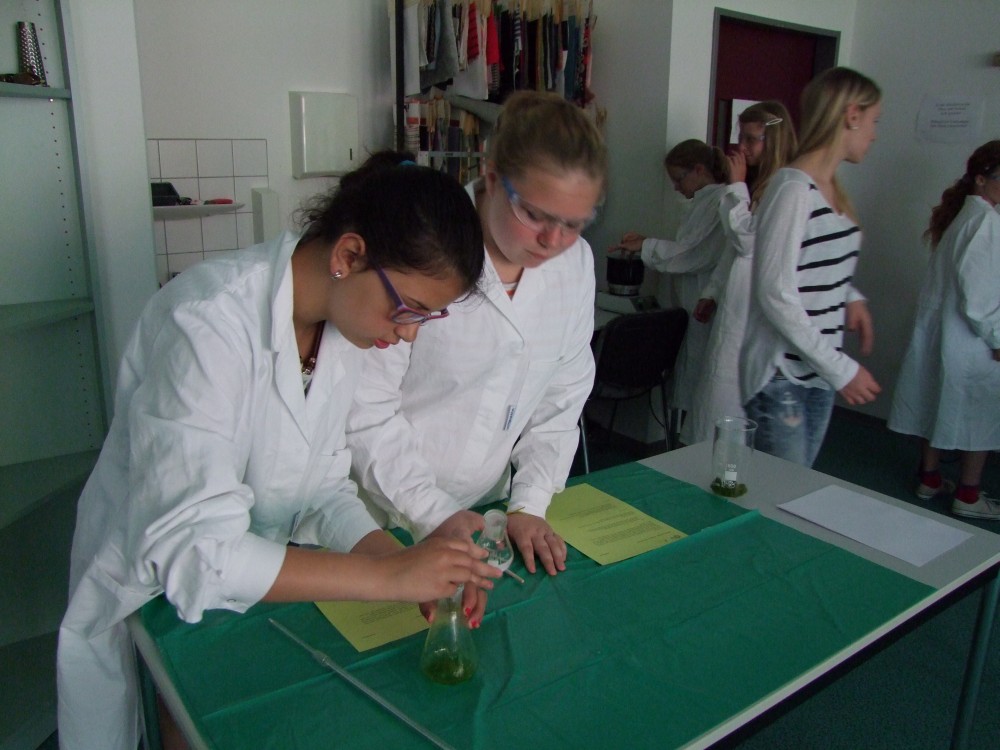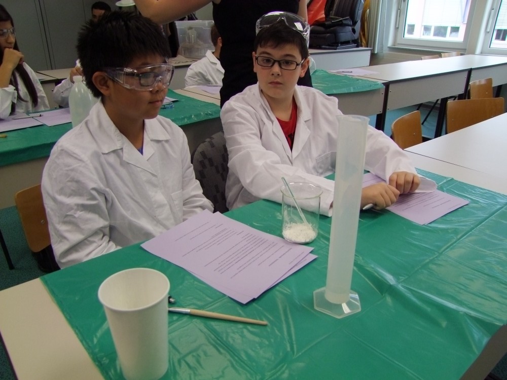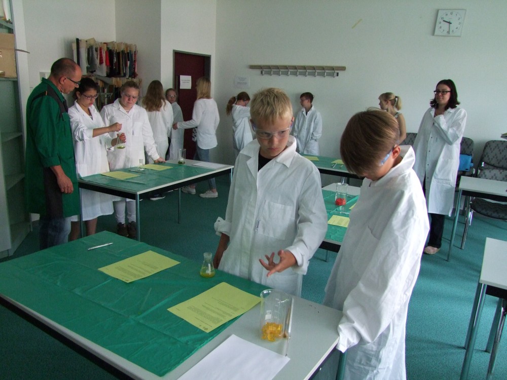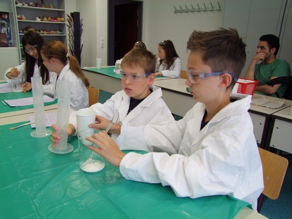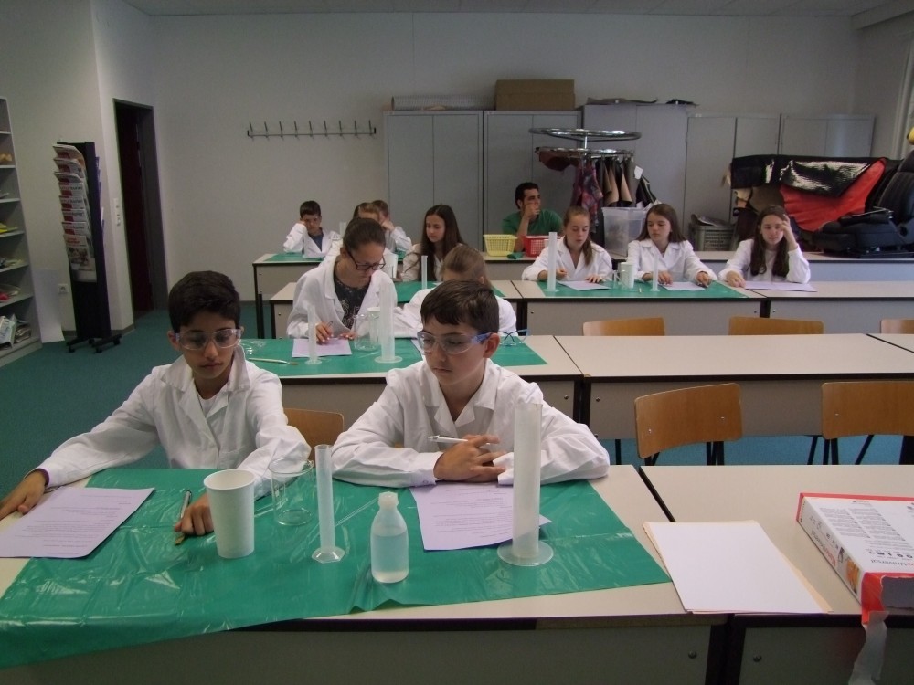 Am 11. Juli 2016 durften die Schülerinnen und Schüler der Klassen 6b und 6c am Tag der Chemie an der Hochschule Kaiserslautern mit Standort Pirmasens teilnehmen. In Zusammenarbeit mit der Firma Kömmerling Chemische Fabrik GmbH und mit Unterstützung der Chemieverbände Rheinland-Pfalz konnten die Schülerinnen und Schüler nach der Begrüßung durch Prof. Dr. Thomas Stumm in drei Workshops rund um das Thema „Klebstoffe" unter Anleitung experimentieren. Dabei durften sie Klebstoffe aus Gummibärchen und Maisstärke herstellen und die Beeinträchtigung des Klebeerfolgs durch unsaubere Oberflächen erforschen. Außerdem durften alle die Labore der Chemietechnik besichtigen und verschiedenste Messinstrumente in Augenschein nehmen.