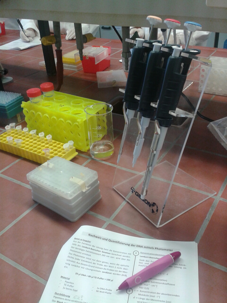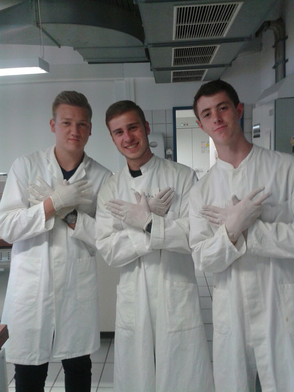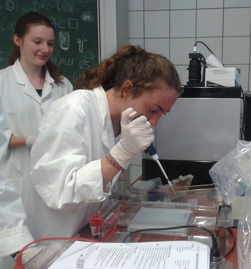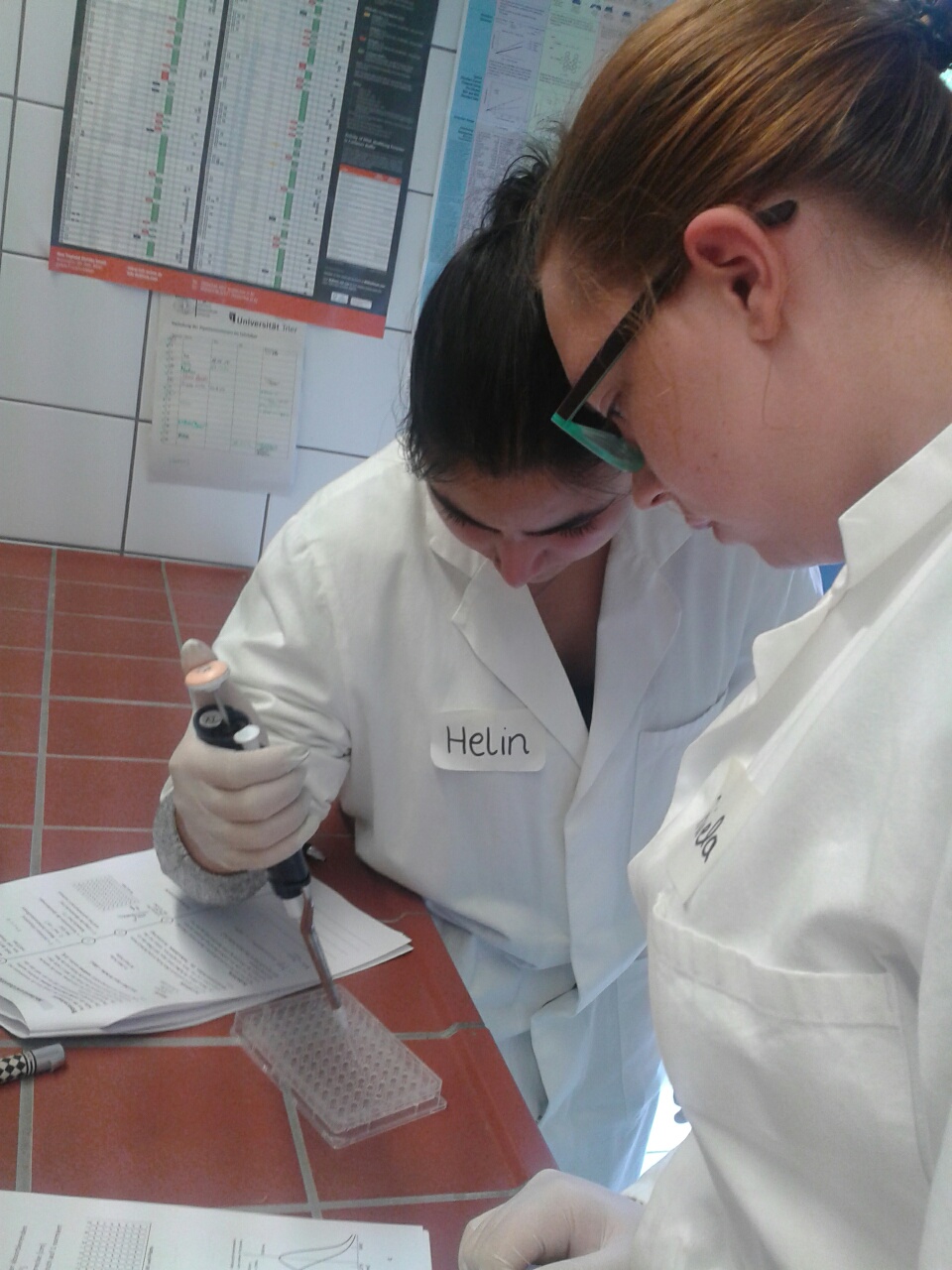 Am Dienstag, den 12.07.2016 konnte der Biologie-Leistungskurs 12 an der Universität Trier einen Praxistag im Labor erleben. Betreut wurde das Praktikum von Mitarbeitern und Wissenschaftlern im Fach Umwelttoxikologie sowie von Frau Sooss. Der Schwerpunkt des Schülerpraktikums lag im Bereich Molekularbiologie und Gentechnik. Die eigene DNA wurde dabei auf den Single Nucleotid Polymorphismus des Gens ALDH2 untersucht. Das Gen ALDH2 codiert für das Enzym Aldehyddehydrogenase (ALDH2), welches u.a. beim Alkoholmetabolismus eine entscheidende Rolle spielt: Alkohol wird zunächst in der Leber durch Alkoholdehydrogenase (ADH2) in toxisches Acetylaldehyd umgewandelt. Anschließend wandelt die Aldehyddehydrogenase (ALDH2) das Zwischenprodukt in Acetat um.