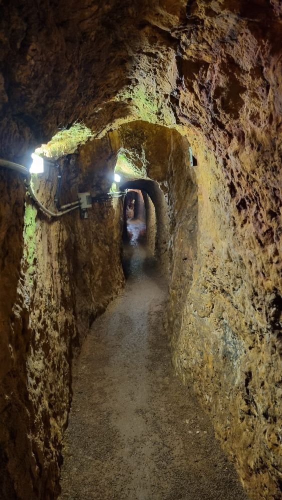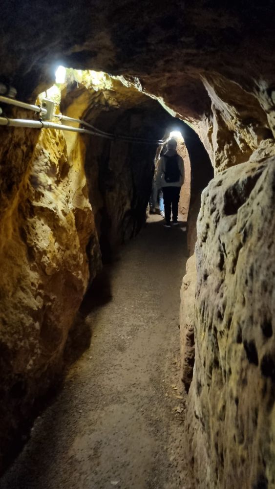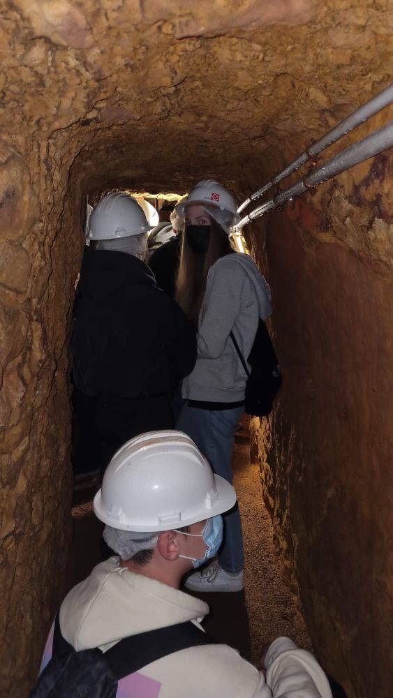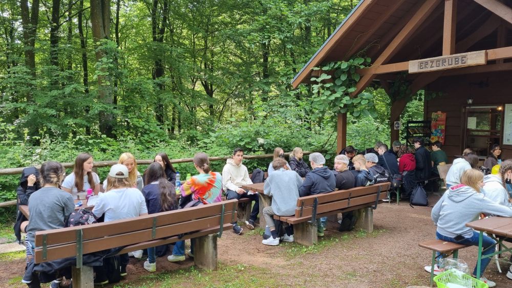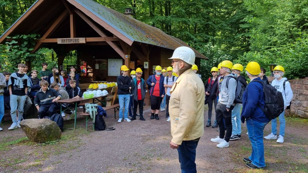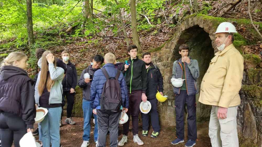 Am 8. Juni 2022 besuchten die Schülerinnen und Schüler der 9. Jahrgangsstufe das Erzbergwerk in Nothweiler. Nach einer kleinen Wanderung Bergauf, erblickt man einen recht unscheinbaren Stolleneingang. Der ca. 0,5 km lange Rundgang war für einige eine Herausforderung, da die Menschen früher sehr viel kleiner waren, als wir heute. Beeindruckend ist die Tatsache, dass der gesamte Stollen in Handarbeit in den Berg getrieben wurde. Läuft man hindurch, so sieht man die farbenprächtig grünen Erzadern im roten Buntsandstein, eine autarke Wasserversorgung mittels einer Zisterne mit absolut klarem Wasser, sowie die erstaunlichen handwerklichen und ingenieurstechnischen Leistungen der damaligen Zeit, die uns noch heute beeindrucken.