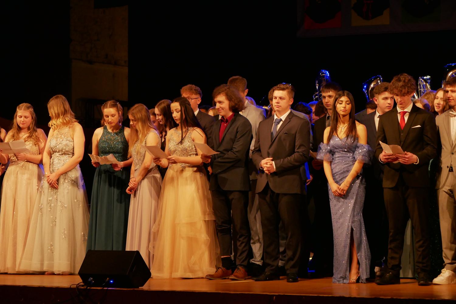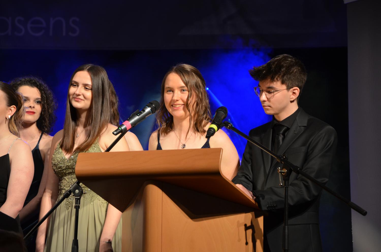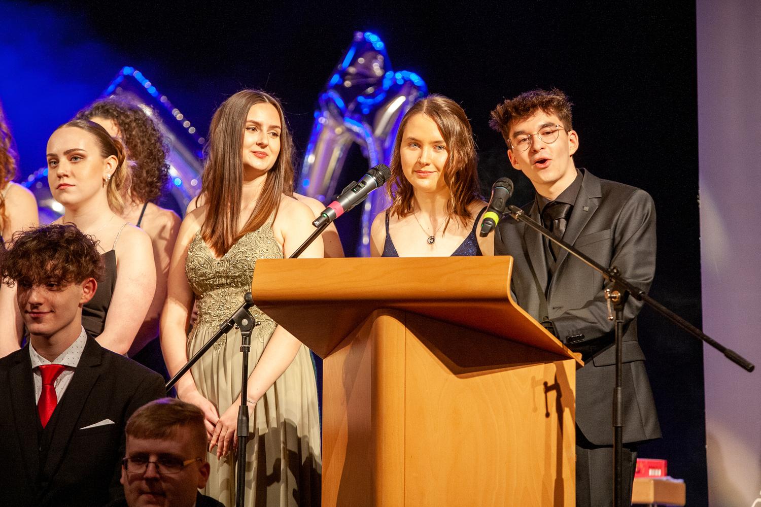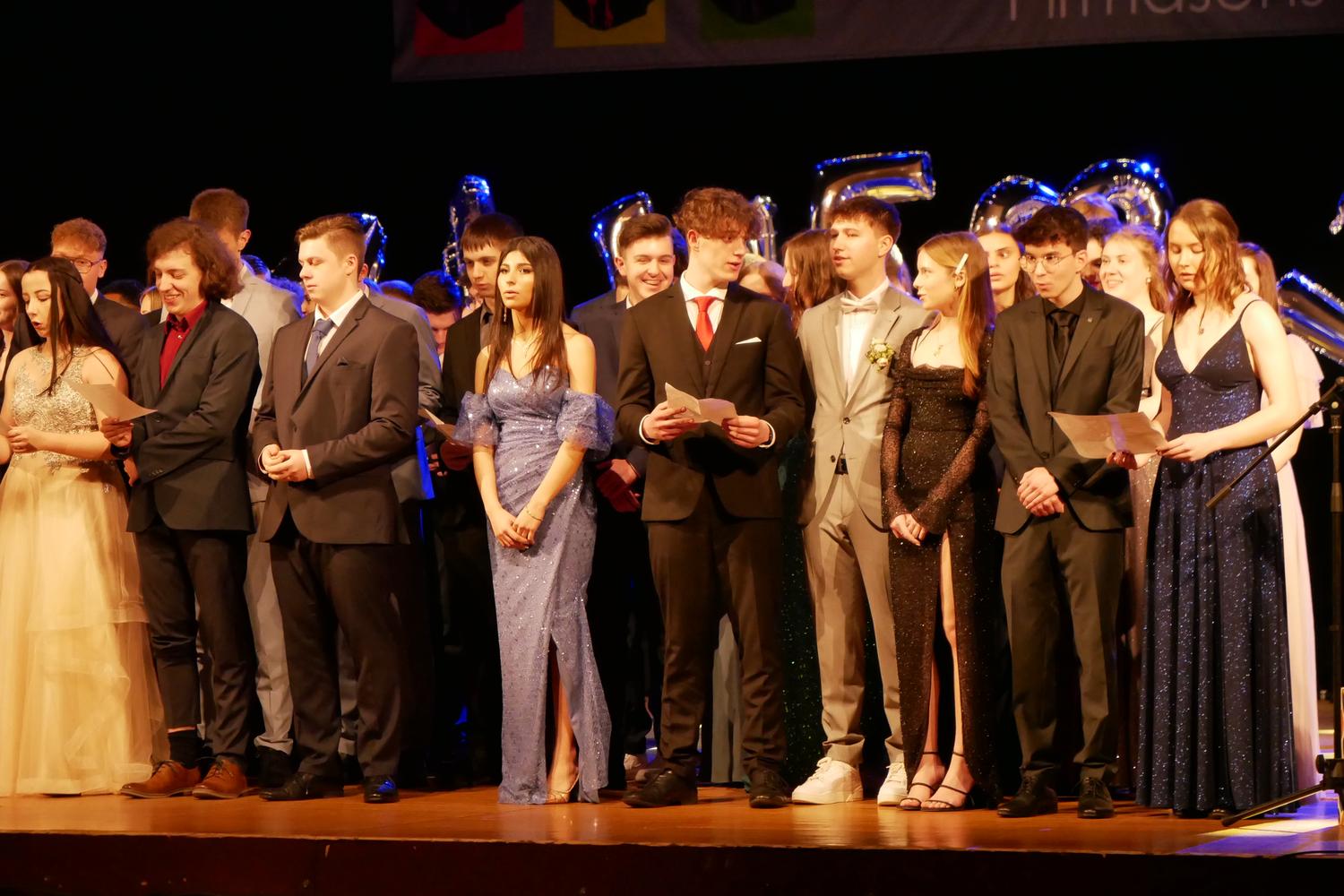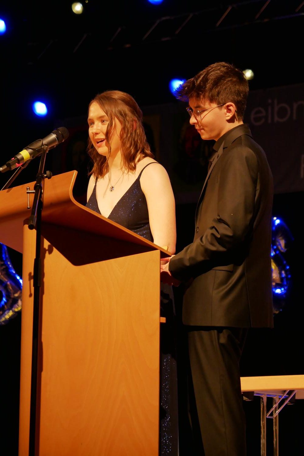 Eröffnet wurde der Abend durch Akim Adam und Leandra Weiß, gefolgt von der Rede des Schulleiters Herrn Mohr. Die ersten Worte waren jedoch nicht seine eigenen, sondern die, des auf KI basierenden Chatprogramms „Chat GPT". Dessen Aufgabe war es, eine Rede zum Thema „Abiball" mit dem Einbezug eines Zitats von Leibniz zu erstellen. Auf den ersten Blick schien dies auch gut funktioniert zu haben, doch bei genauerer Betrachtung erkannte man die Schwächen eines solchen Programms. Zu unpersönlich, sehr allgemein formuliert und auch mit einem Zitat, welches bei exakter Recherche nicht von Leibniz selbst stammte. So fand Herr Mohr im Anschluss die persönlicheren Worte an den Abiturjahrgang und erinnerte auch daran, kritisches Denken und das Hinterfragen von Sachverhalten zu wahren und betonte, dass es auch in den Händen der Absolventinnen und Absolventen liegt, ihren Teil beizutragen, sodass künstliche Intelligenzen unser Leben bereichern können. Denn, KI hat bereits an vielen Stellen ihren Einzug in unseren Alltag erhalten und kann nach Stephen Hawking, so Herr Mohr, entweder „das Beste oder das Schlimmste sein, was der Menschheit passieren kann".