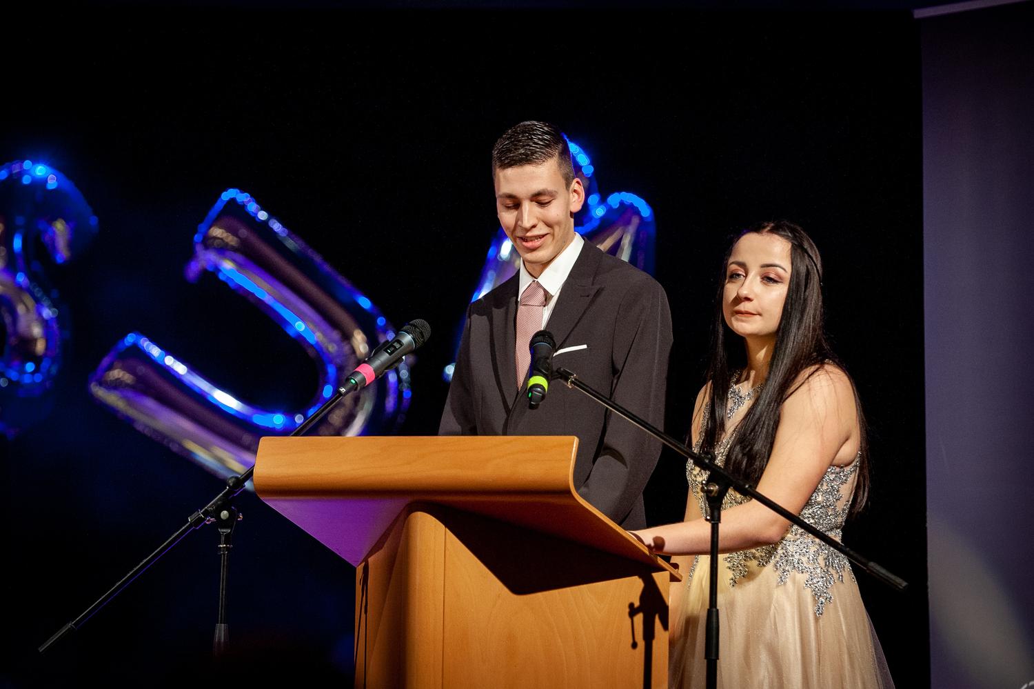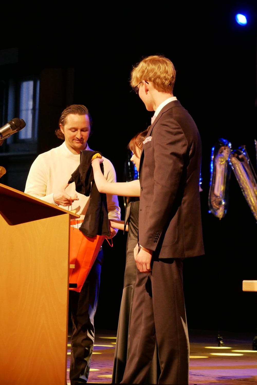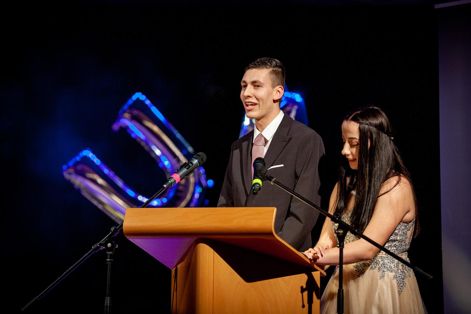Seitens der Abiturientinnen und Abiturienten übernahmen Selina Lauer und Florian Schilling die Bühne, um ebenfalls ein paar Worte an die Anwesenden zu richten. Mit viel Humor ließ man die Schulzeit Revue passieren, erzählte von Klassen- und Studienfahrten, von für das Leben gelernten Dingen, aber auch der ein oder anderen mathematischen Gleichung, welche man wohl eher nicht mehr brauchen wird, sowie dem immer weiteren Zusammenwachsen der Stufe als Gemeinschaft. Ganz so „Lost in Space", wie es im Abimotto steht, scheint es wohl doch nicht zu sein. Aber auch wie ihr Vorredner hoben sie nochmals ihre Aufgabe auf ihrem neuen Lebensweg, die Welt mitzugestalten, hervor.