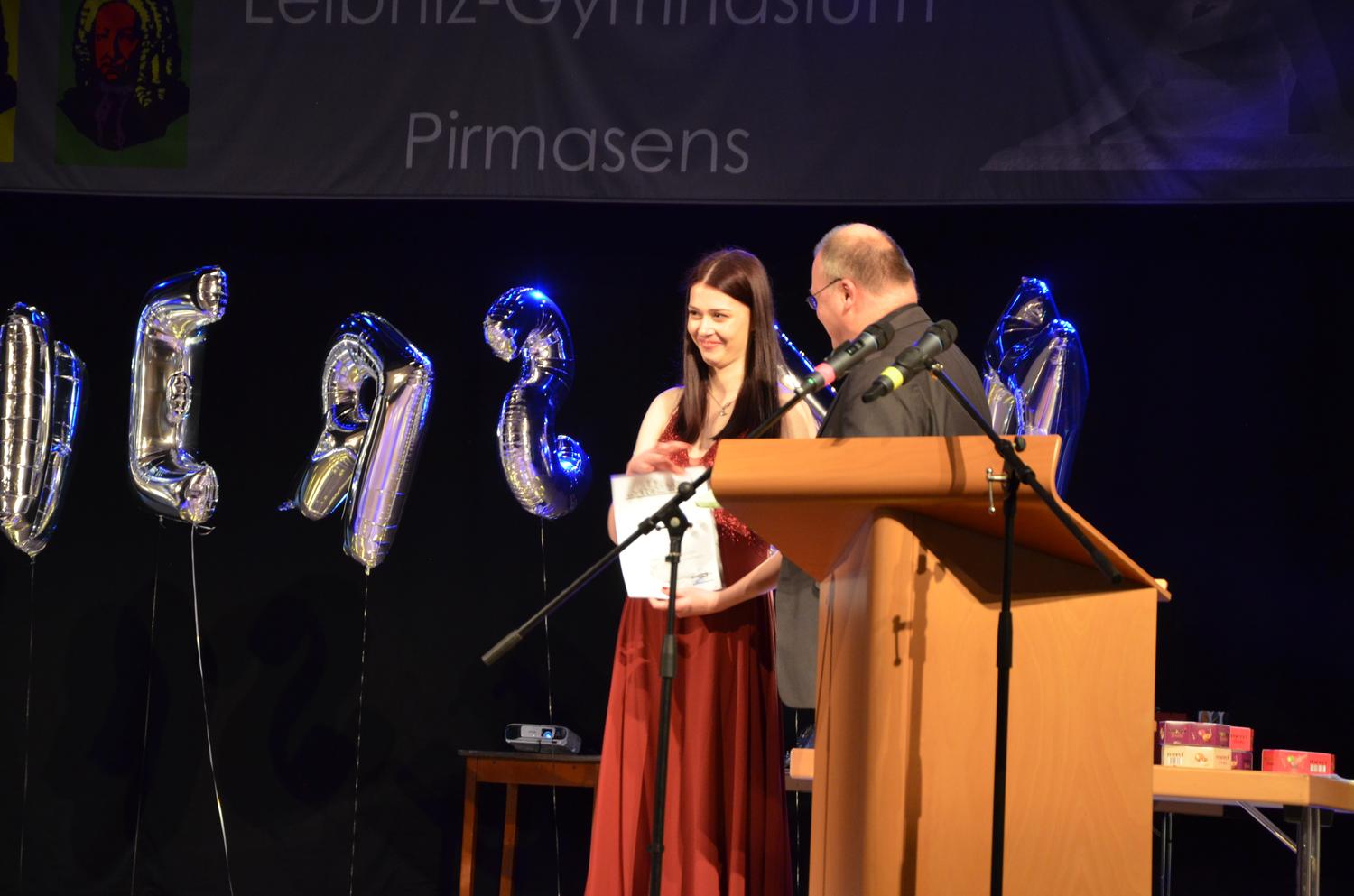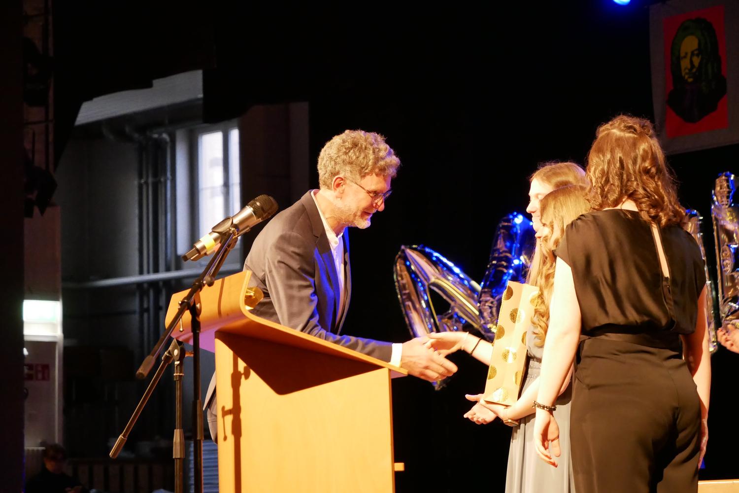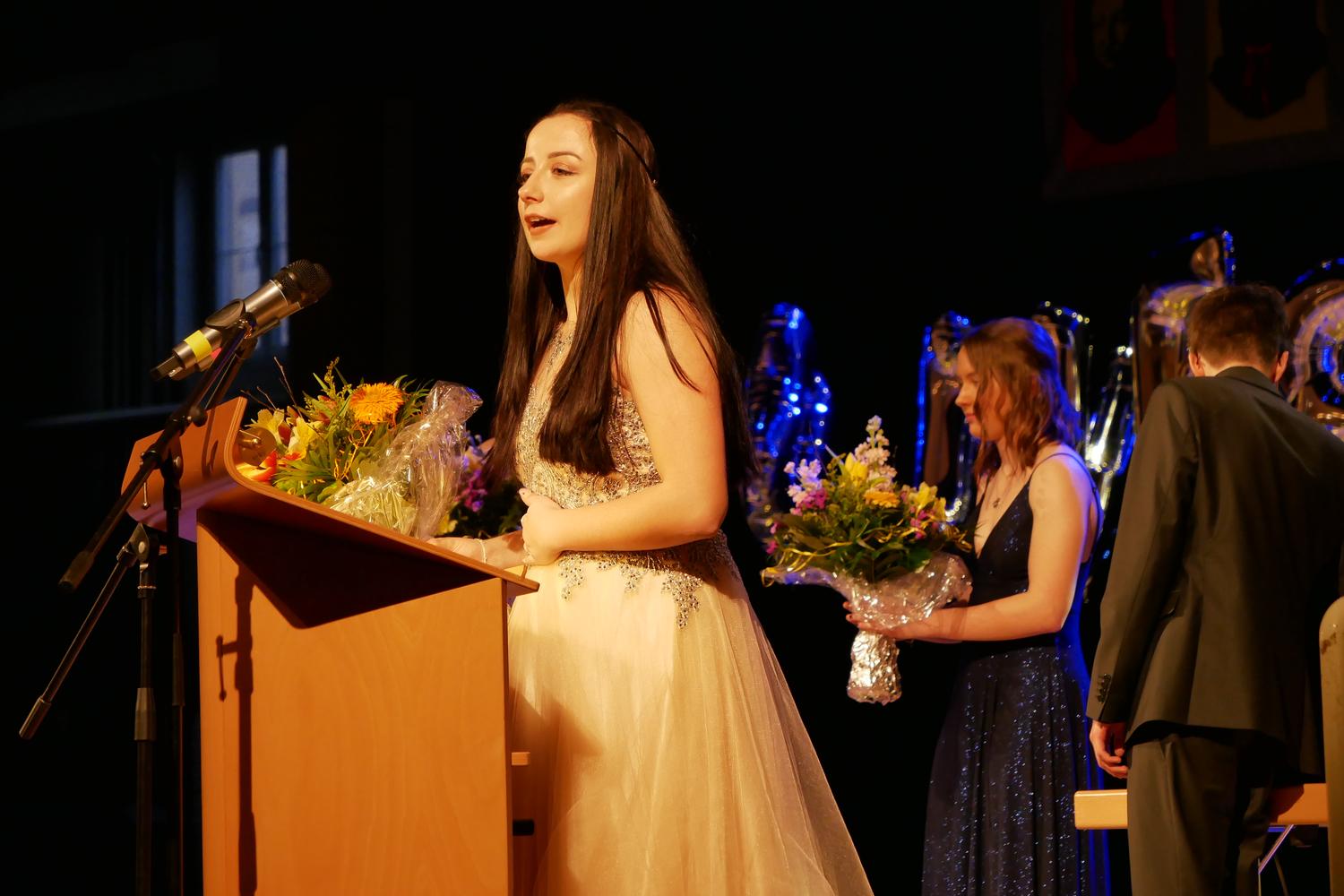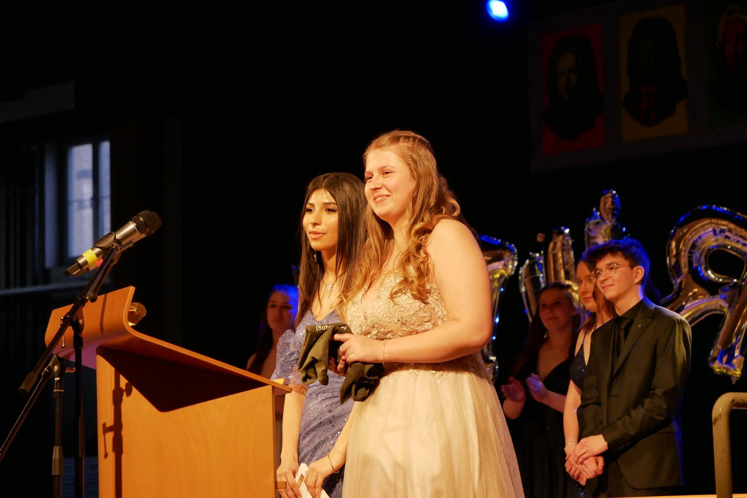 Neben der Vergabe der Abiturzeugnisse, welche sehnlichst erwartet wurden, sollten ebenfalls einzelne der ehemaligen Schülerinnen und Schüler für ihre besonderen Leistungen geehrt werden. Allen voran ist hier Leandra Weiß zu nennen. Insgesamt wurden 6 der 21 Preise an sie verliehen. Unter anderem auch der Slodkipreis für die beste Gesamtleistung in ihrem Jahrgang. Neben Leandra ist aber auch Stella Spies zu nennen, welche ebenfalls das Abitur mit Bestnote 1,0 bestanden hat und nur knapp die Wahl an Leandra abgeben musste.