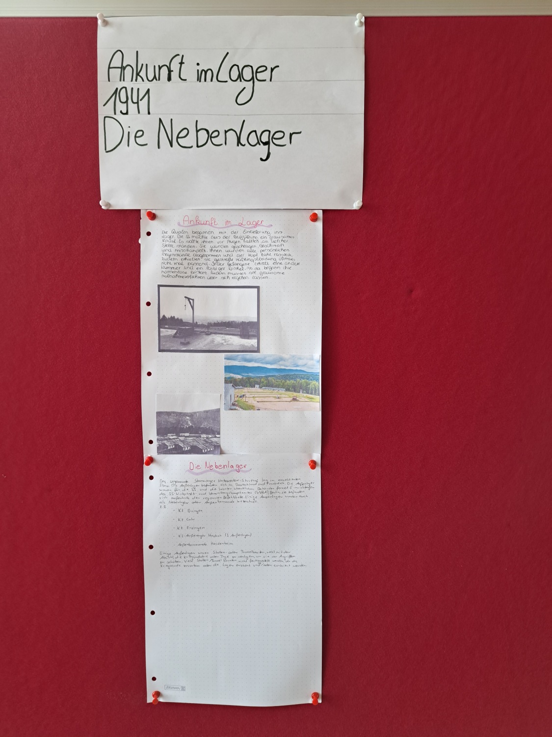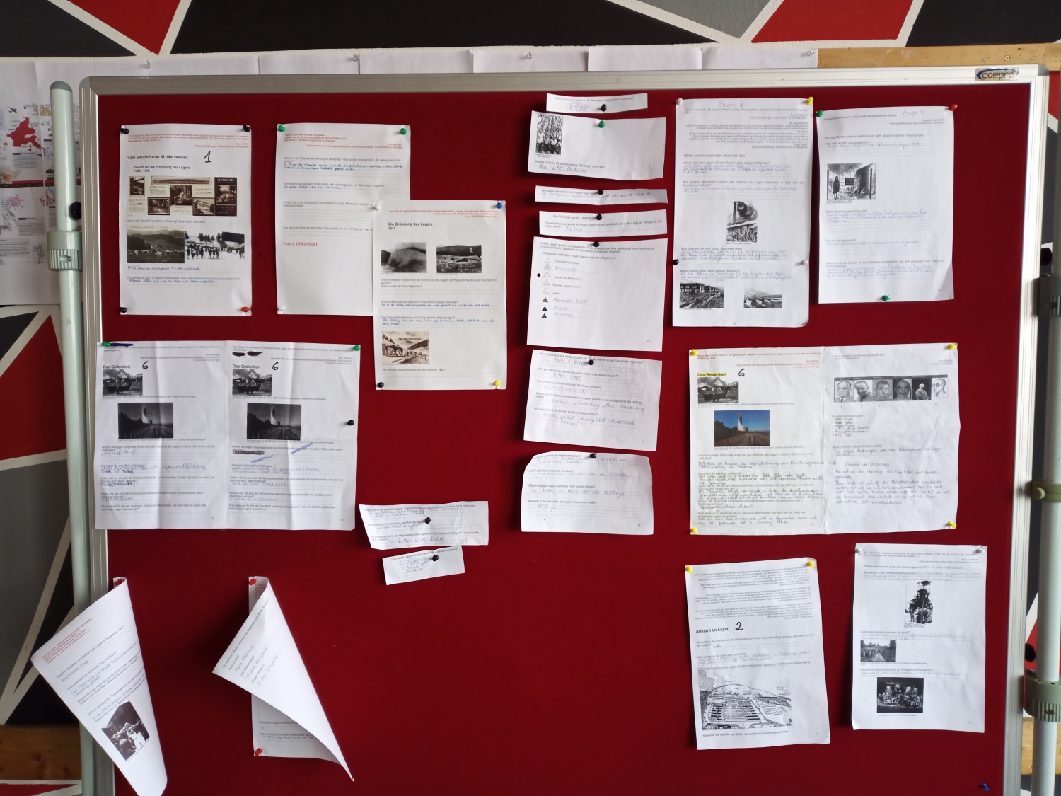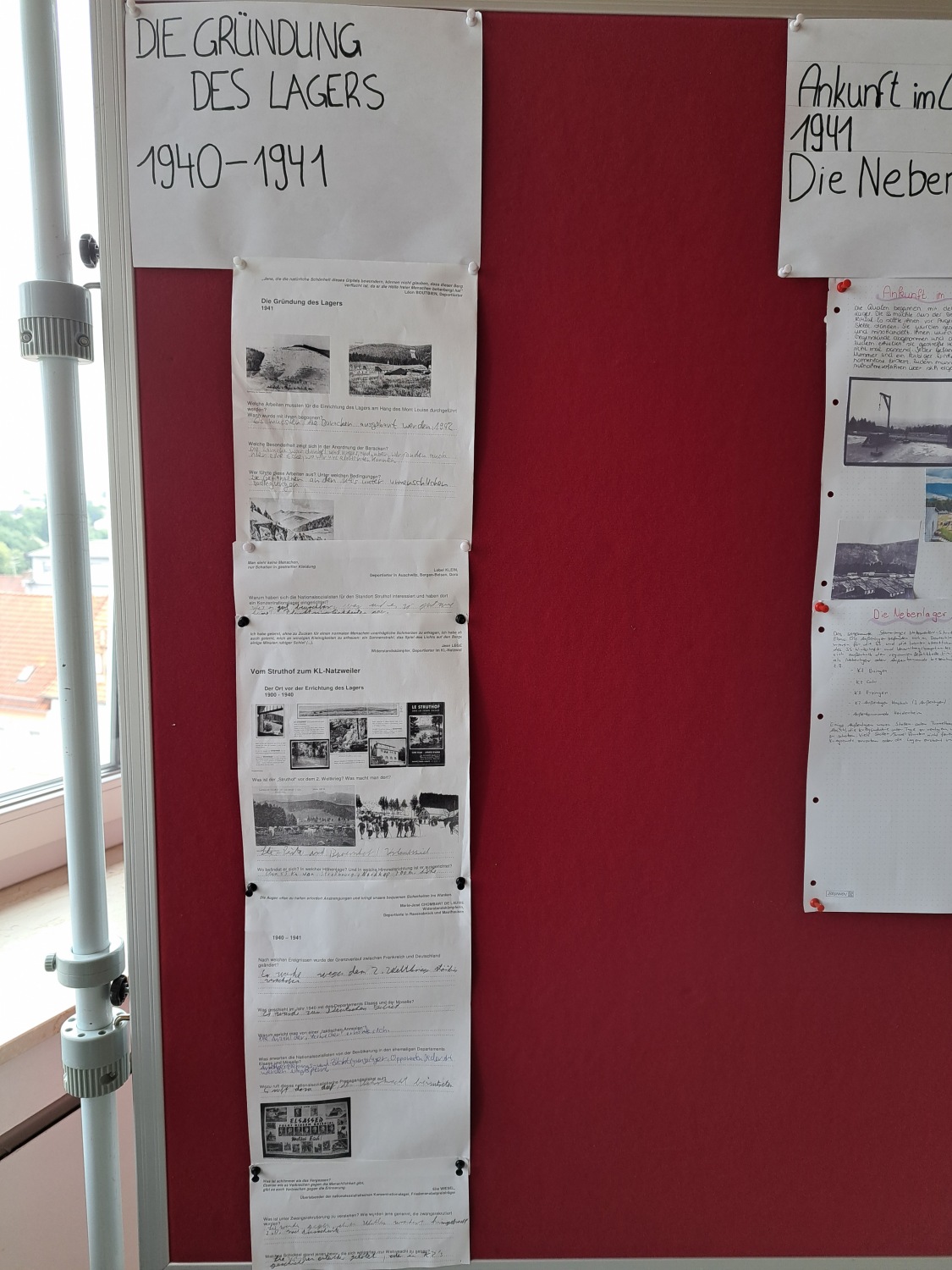 In den Geschichtsstunden nach der Exkursion gab es großen Redebedarf, viele Eindrücke und Emotionen mussten besprochen und verarbeitet werden. Das Gedenken an die Opfer nahm einen großen Raum ein. Aus den Ergebnissen des Begleitmaterials und eigenen Fotos entstand eine kleine Ausstellung, die einen Überblick über das Konzentrationslager Natzweiler gibt und in den Klassenräumen der Stufe 9 (3-06, 3-08, 3-10) zu besichtigen ist.