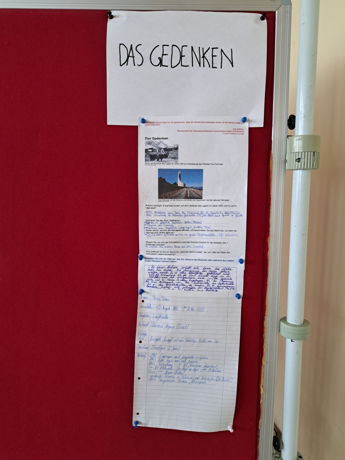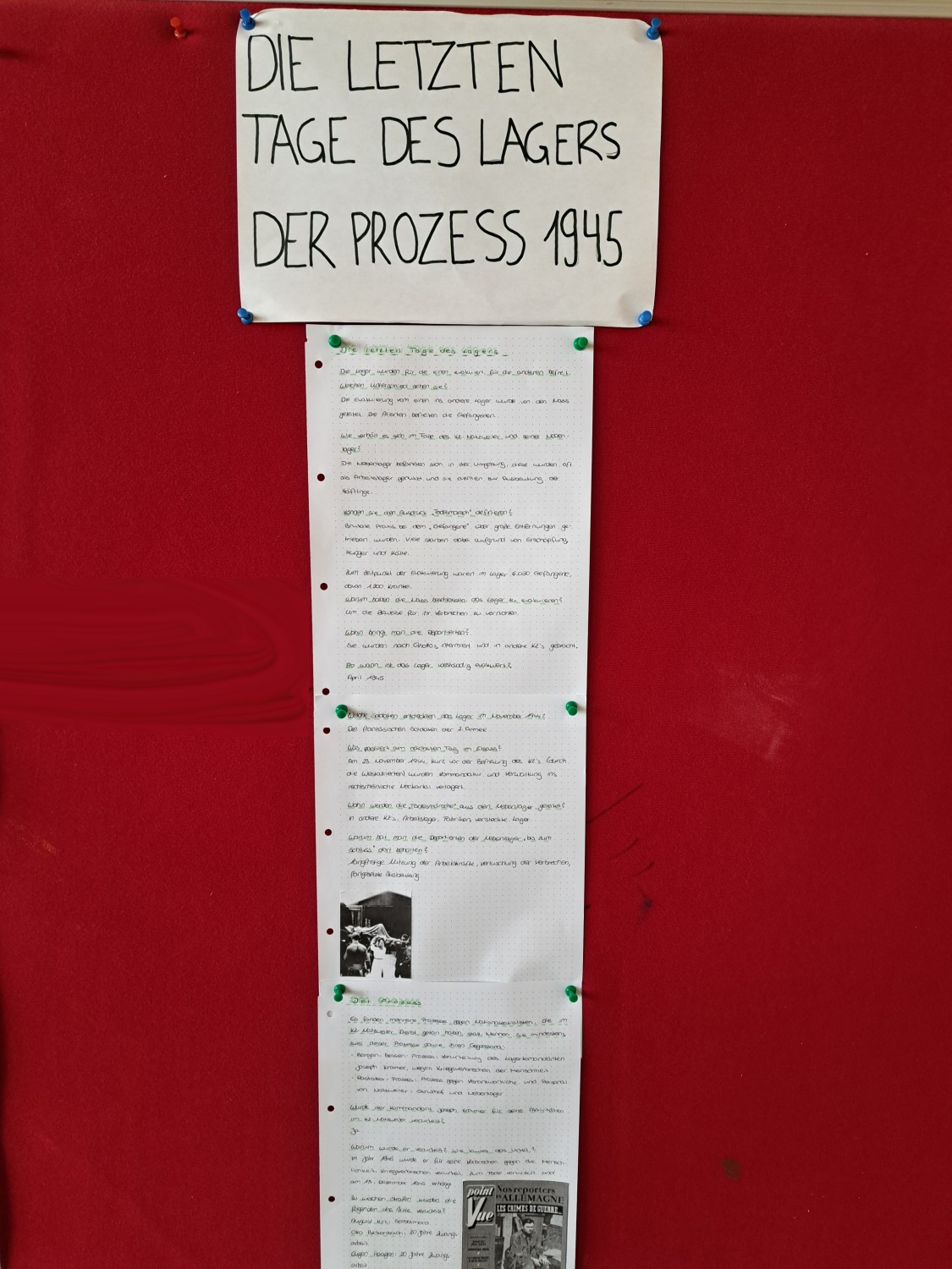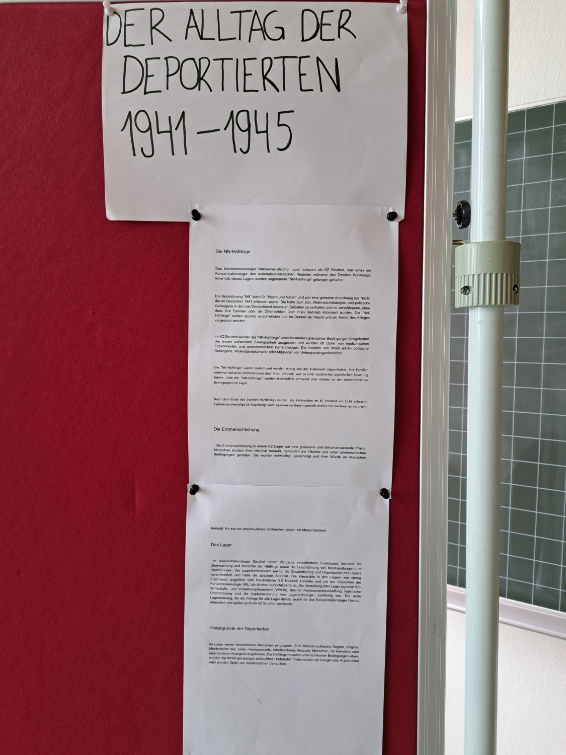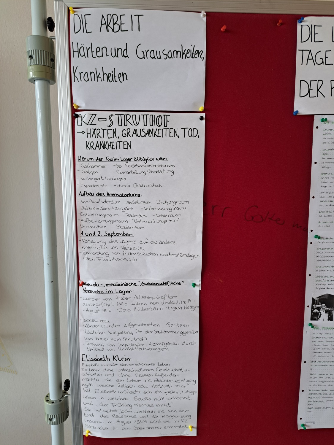 In den Geschichtsstunden nach der Exkursion gab es großen Redebedarf, viele Eindrücke und Emotionen mussten besprochen und verarbeitet werden. Das Gedenken an die Opfer nahm einen großen Raum ein. Aus den Ergebnissen des Begleitmaterials und eigenen Fotos entstand eine kleine Ausstellung, die einen Überblick über das Konzentrationslager Natzweiler gibt und in den Klassenräumen der Stufe 9 (3-06, 3-08, 3-10) zu besichtigen ist.
