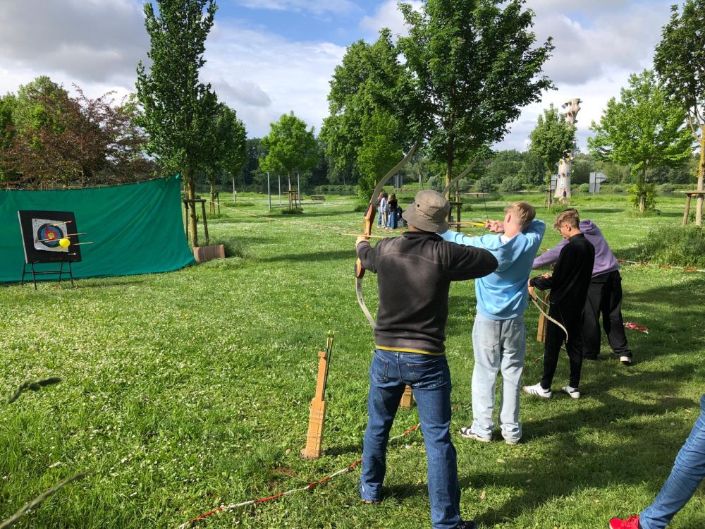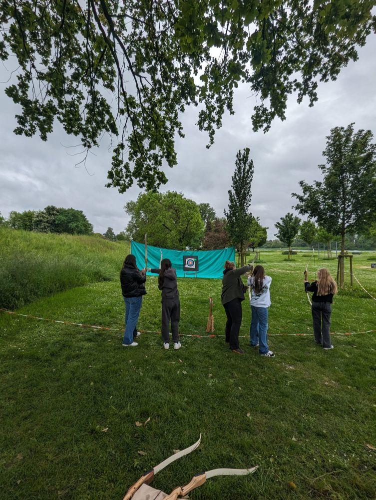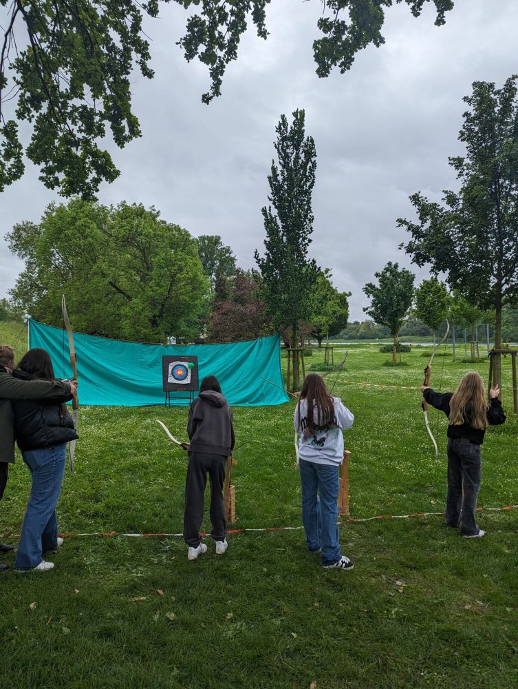 Am Dienstag gab es ab 7 Uhr Frühstück, bevor es dann um 9 Uhr mit den Workshops weiterging. Während die 8A und 8C mit Upcycling und Bogenschießen dran waren, hatte 8B Waldpädagogik auf dem Programm. Sie machten Spiele, die den Zusammenhalt in der Klasse förderten und lernten praktische Sachen über den Wald.
