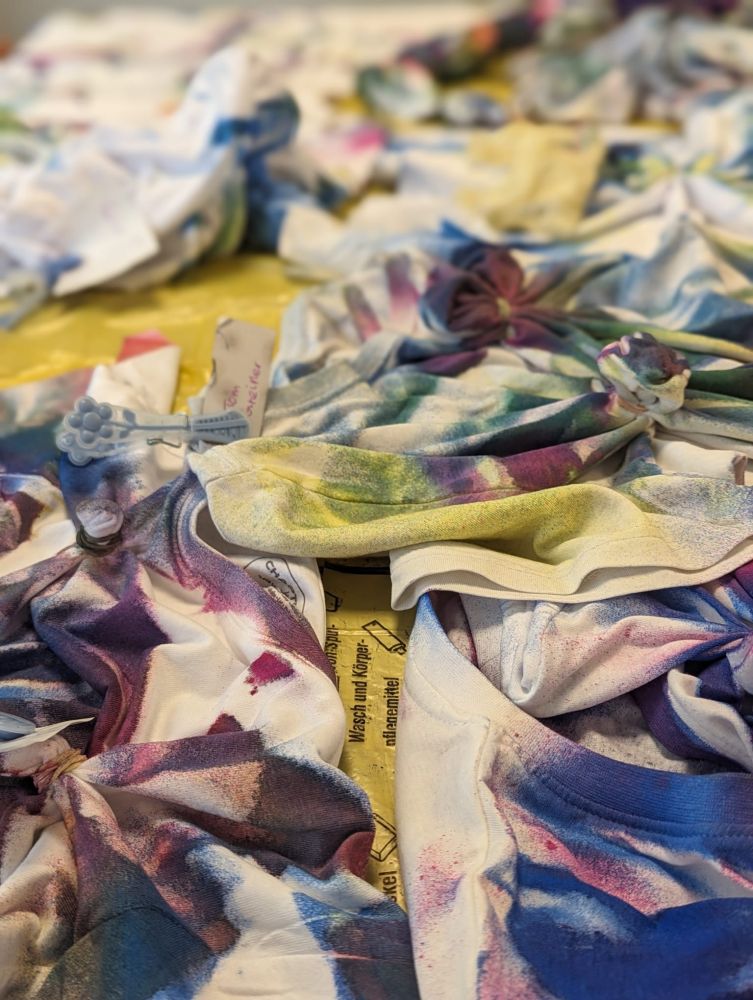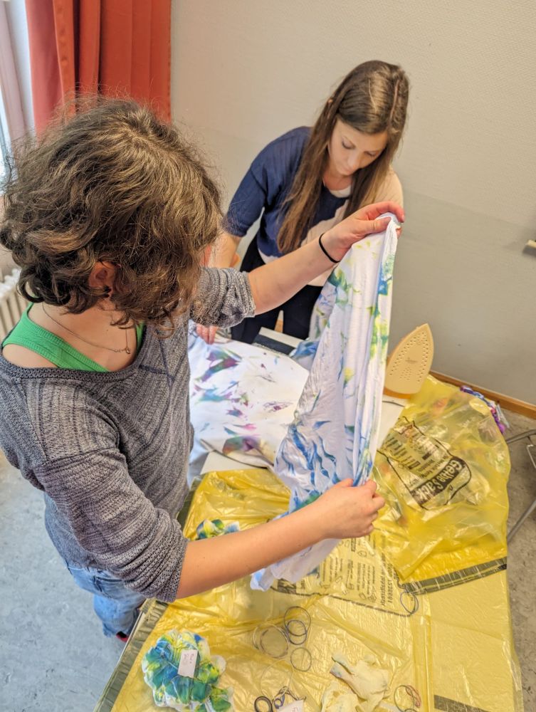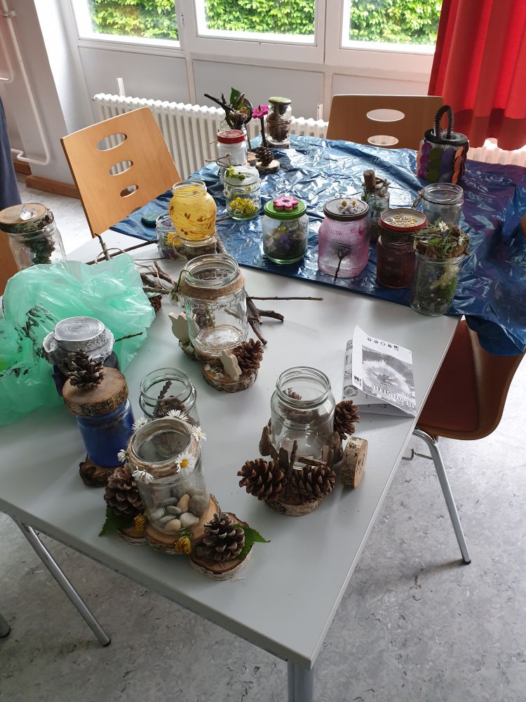 Um 14 Uhr trafen wir uns dann wieder an der Jugendherberge, um weitere Aktivitäten zu erledigen. Langweilig wurde uns nie! Die Mädchen der 8C machten den Teig für das Stockbrot, welches wir am Abend grillten. Die Jungs schlugen im Wald die Haselnussstecken dafür. Währenddessen war die 8B beim Bogenschießen und musste im Wald bestimmte Sachen sammeln, wie etwas Spitzes, etwas, das wie eine Schlange aussieht, etwas mit Zähnen und so weiter. In dieser Zeit hat die 8A beim Upcyclingprojekt mit alten mitgebrachten Gläsern gebastelt. Daraus konnte man Windlichter oder auch Mutter- oder Vatertagsgeschenke machen. Dazu wurden Blumen, Treibholz aus dem Rhein, Sprühfarben, Gräser und Metallstücke vom Schrottplatz benutzt. Alle Workshops gingen dann über in ein kreatives Projekt, bei dem Haargummis und selbst mitgebrachte Kleidungsstücke wie T-Shirts oder Socken gebatikt wurden. Entweder hat man seine Kleidungsstücke nach dem Eindrehen und festbinden mit Farbe angesprüht, oder man hat alles in Farbe eingelegt. Einen Tag später konnte man das fertige Kunstwerk abholen. Bis zum Abendessen um 18 Uhr hatten wir noch freie Zeit auf dem weitläufigen Gelände der Jugendherberge.