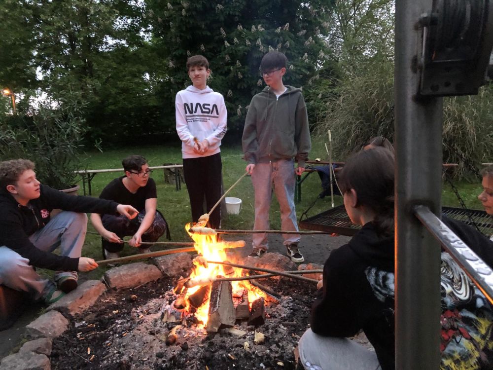 Das Abendessen bestand aus einem Büffet mit Nudeln, Soßen und vor allem viel Gemüse. Es war also für jeden etwas dabei. Nach dem Abendessen und einer kleinen Ansprache hatten wir noch mal kurz frei. Danach ließen wir den ersten Tag mit dem Grillen von Stockbrot über dem Lagerfeuer, Musik, Spielen und geselligem Beisammensein ausklingen. Ab 22 Uhr war Bettruhe und alle sind sehr müde ins Bett gefallen.