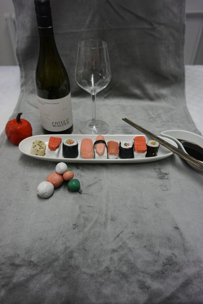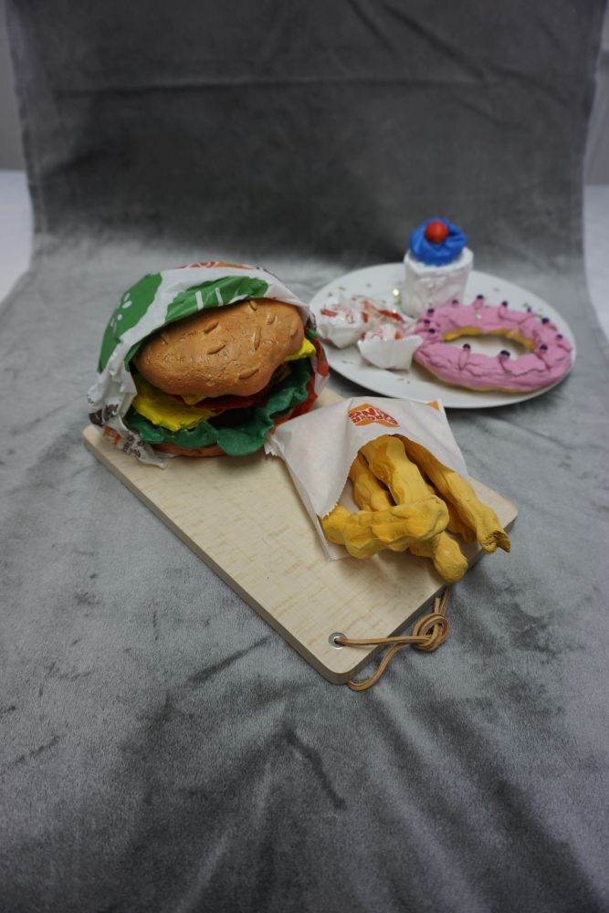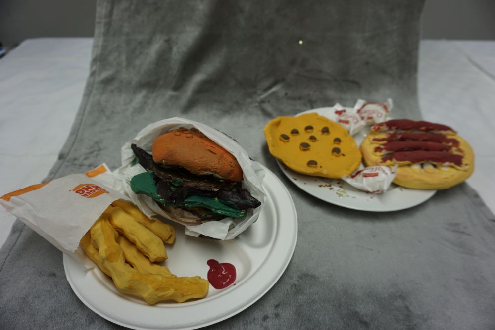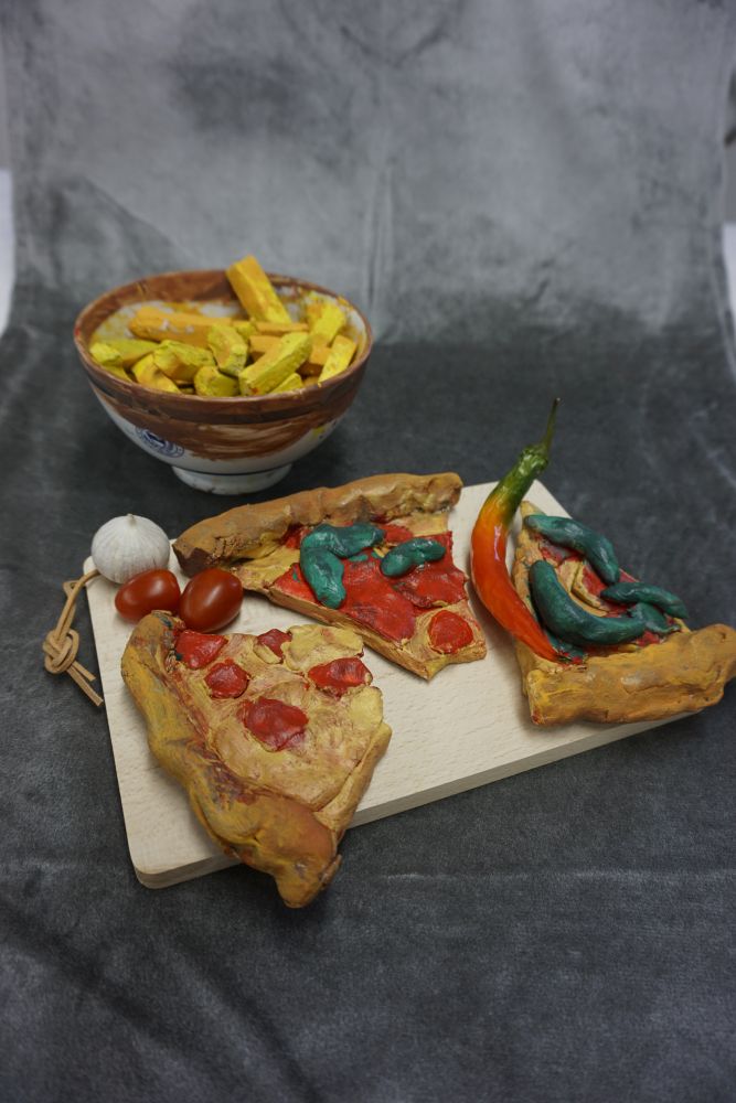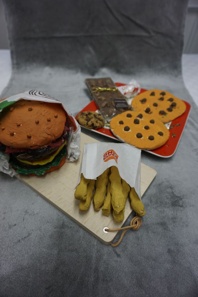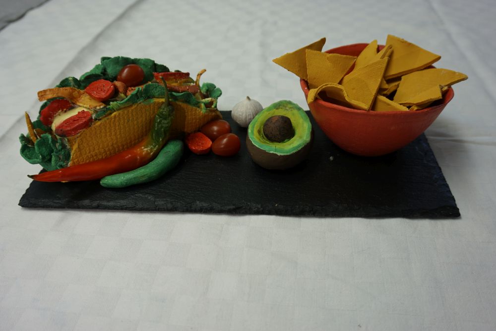 Um den Tonspeisen den End Look zu geben, bemalten sie die Klasse mit Acryl- und Wasserfarben. Frau Weilbach-Pieters schlug der Klasse vor, richtiges Essen mit in die Schule zu bringen und es zu den Werken zu legen. Also positionierte die Klasse zum Beispiel Pommes oder auch Kekse zu ihren Menüs. Als Abschluss haben sie noch ein Food Festival für alle Sinne gefeiert.