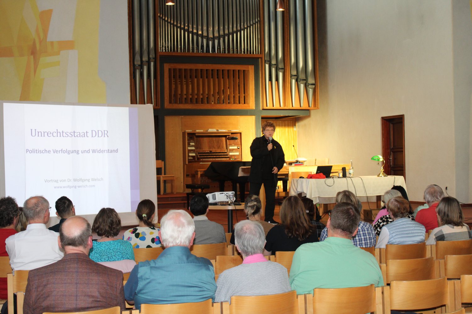 Herr Dr. Welsch schilderte sehr ausführlich seine persönlichen Erfahrungen. Er berichtete von seiner Verhaftung und Haftzeit in der DDR über seine Tätigkeit als Fluchthelfer, durch die er über 200 Menschen zur Freiheit verhalf, bis hin zu den mehrfachen Mordanschlägen der Stasi auf sein Leben. Die zahlreichen Besucherinnen und Besucher verfolgten seine Erzählungen mit großer Aufmerksamkeit. Im Anschluss entwickelte sich eine lebhafte Fragerunde, die eindrucksvoll zeigte, wie groß das Interesse am Thema DDR und der persönlichen Freiheit noch heute ist.