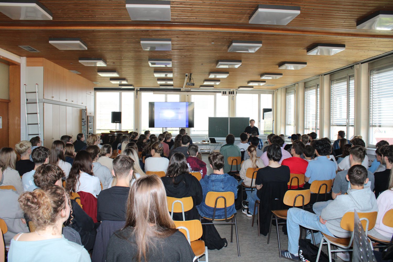 Am darauffolgenden Tag war Herr Dr. Welsch zu Gast am Leibniz-Gymnasium Pirmasens. In einer gekürzten Fassung präsentierte er den Schülerinnen und Schülern seine Erlebnisse und Erfahrungen im Umgang mit der SED-Diktatur. Besonders eindringlich stellte er dabei die Wichtigkeit der persönlichen Freiheit als zentrales Gut heraus. Auch hier gab es zum Abschluss eine rege Diskussion, bei der die Jugendlichen Gelegenheit hatten, ihre Fragen zu stellen und ihr Wissen zur DDR zu vertiefen.