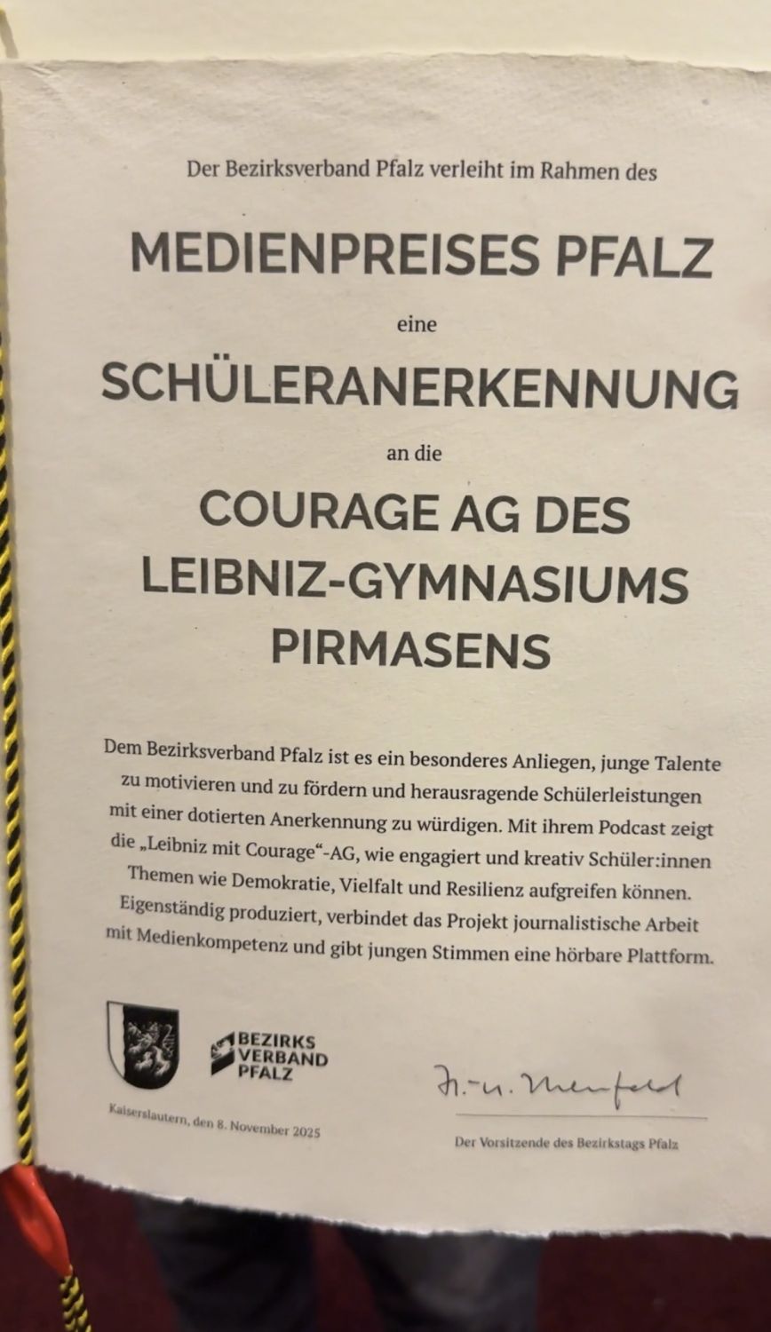Der Bezirksverband Pfalz würdigte unseren Podcast über die Schulveranstaltung vom 8. November 2024 mit der Schüleranerkennung des Medienpreises Pfalz. Neben den 500 Euro Preisgeld für unsere AG-Kasse freute uns vor allem, gesehen und gehört zu werden. Denn was unsere Schülerinnen und Schüler jedes Mal tun, hat viel mit Courage zu tun. Wir wissen, dass unsere Schulgemeinschaft reich an Menschen mit einem klaren, demokratisch geprägten moralischen Kompass ist – doch sich damit in eine digitale und permanente Öffentlichkeit zu begeben, bedeutet für junge Menschen ohne gefestigtes berufliches Fundament auch ein Risiko. Gerade in einer Zeit, in der in den sozialen Medien die lauten und extremen Stimmen immer mehr Raum gewinnen, ist es umso wichtiger, dass auch die reflektierten, demokratischen Stimmen dieser Generation Gehör finden. Umso dankbarer sind wir, dass dies gestern in Kaiserslautern geschehen ist.