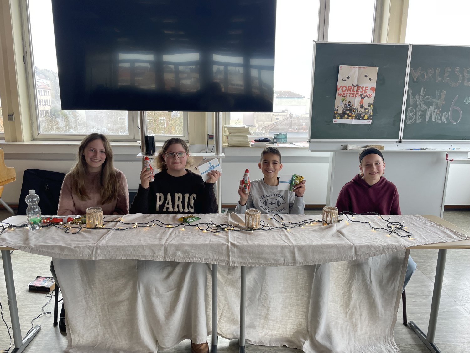 Am 02. Dezember 2025 war es soweit. Die vier Klassensieger*innen der sechsten Klassen kamen im Beisein all ihrer Mitschüler*innen und unseres Schulleiters Herr Mohr im großen Musiksaal zusammen. Dort präsentierten sie ihr Lese-Können, um den Schulsieger/ die Schulsiegerin zu ermitteln.
