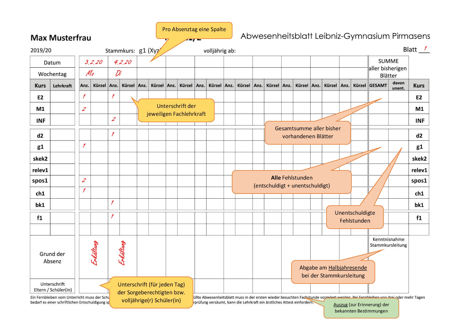 Dazu dient das ausgeteilte Abwesenheitsblatt, auf dem alle Absenzen eines Halbjahres gesammelt werden.- Eine Erkrankung muss an Tagen, für die eine Leistungsüberprüfung angekündigt wurde, der Schule vor Schulbeginn angezeigt werden (Telefon, Fax).